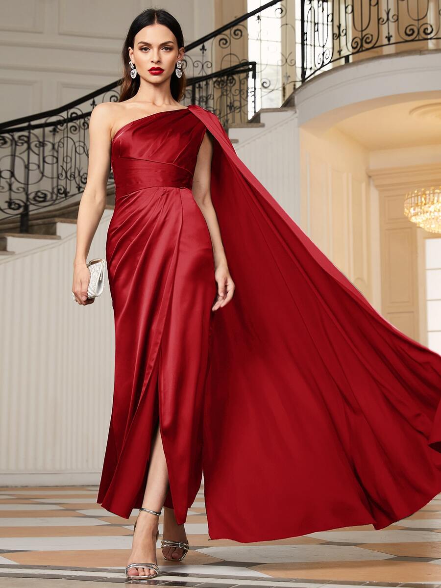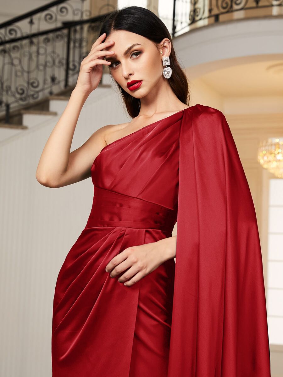 One Shoulder Cloak Sleeve Ruched Wrap Dress