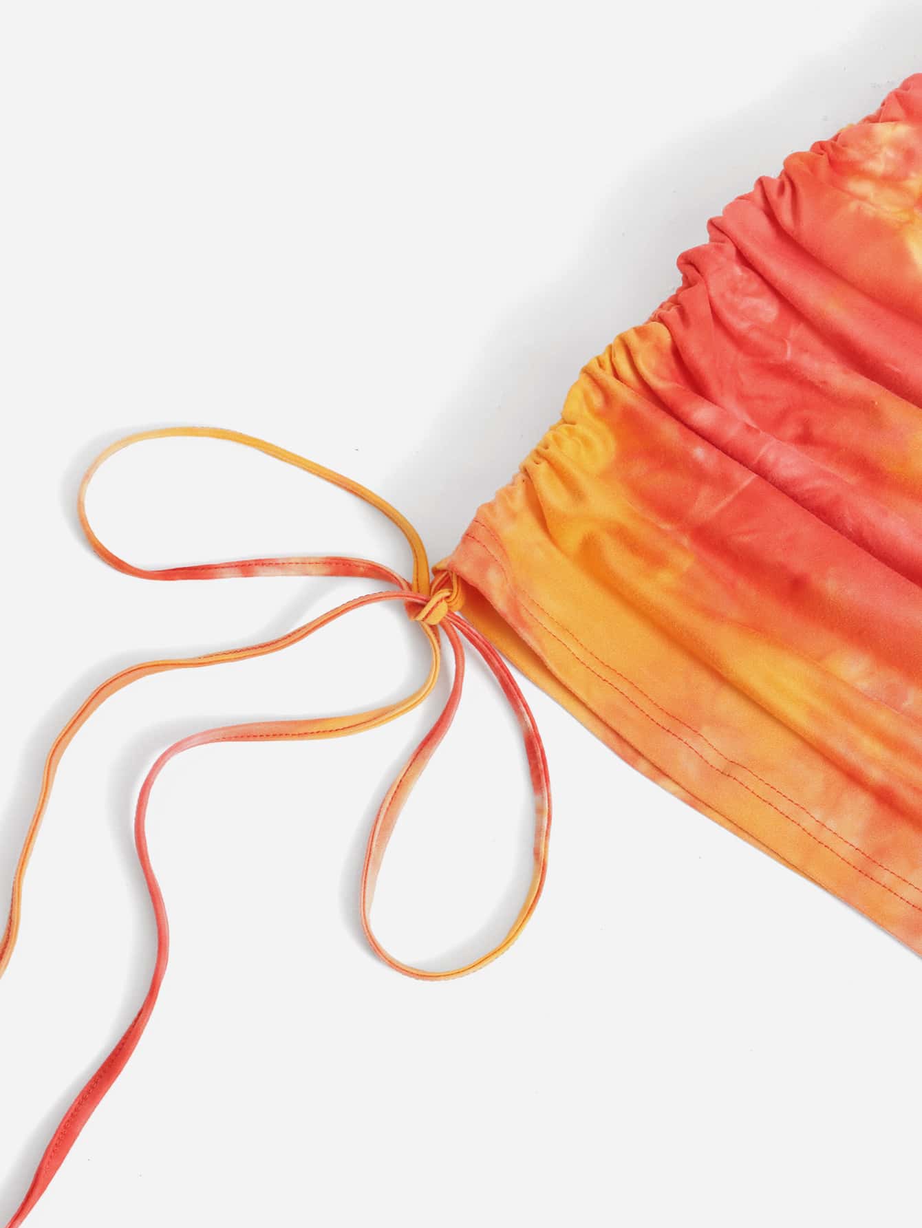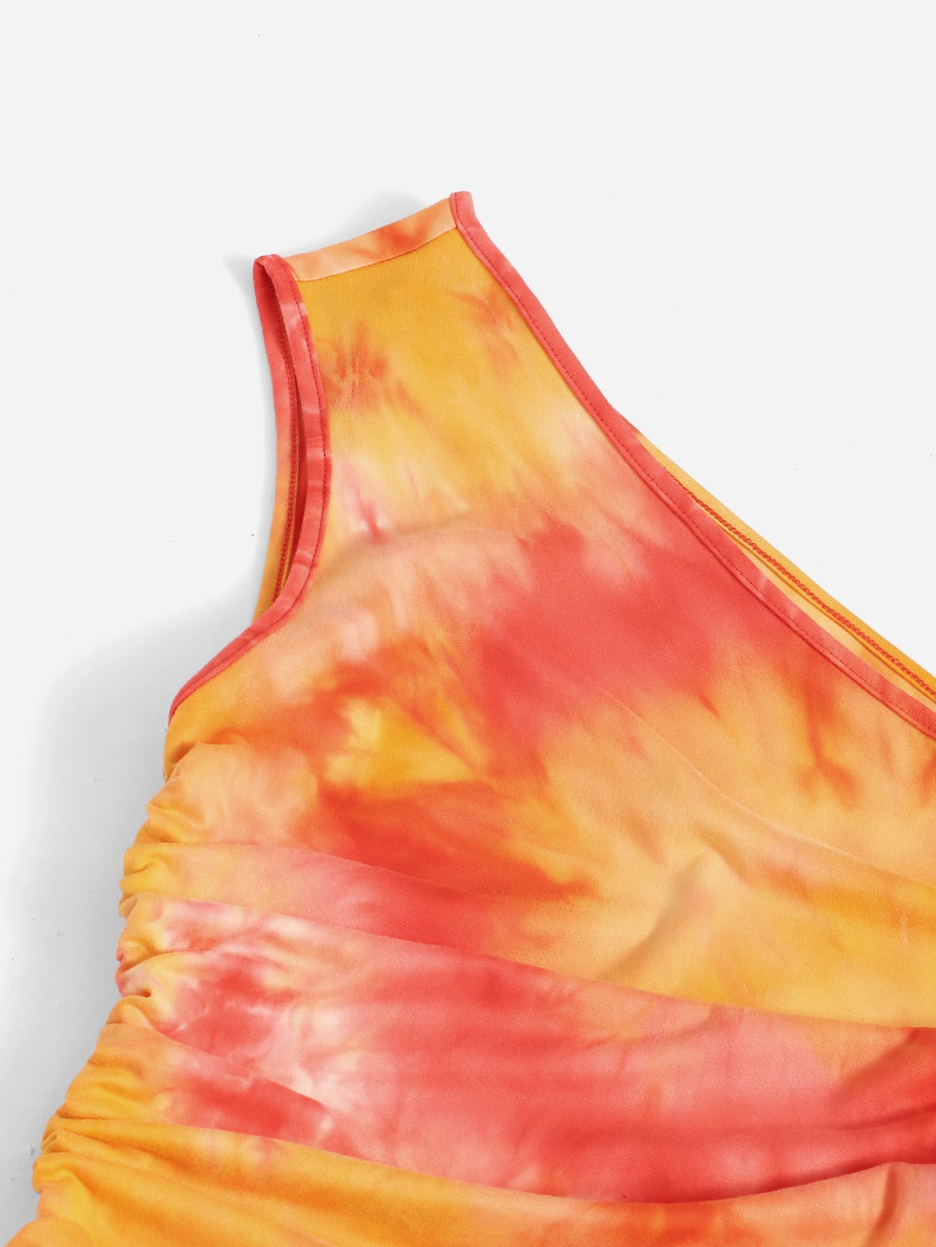 One Shoulder Drawstring Knot Ruched Tie Dye Dress
