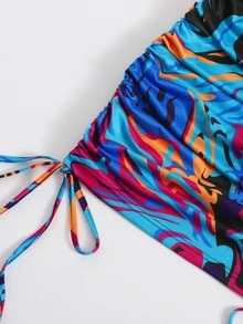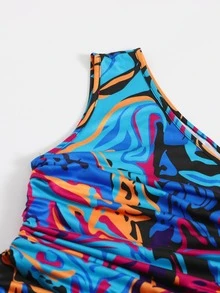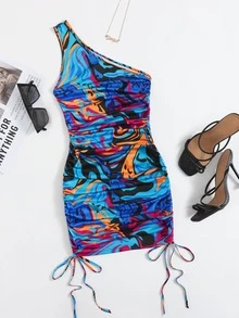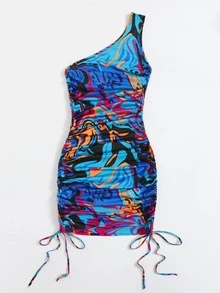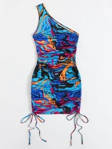 One Shoulder Drawstring Ruched Side Graphic Print Dress