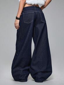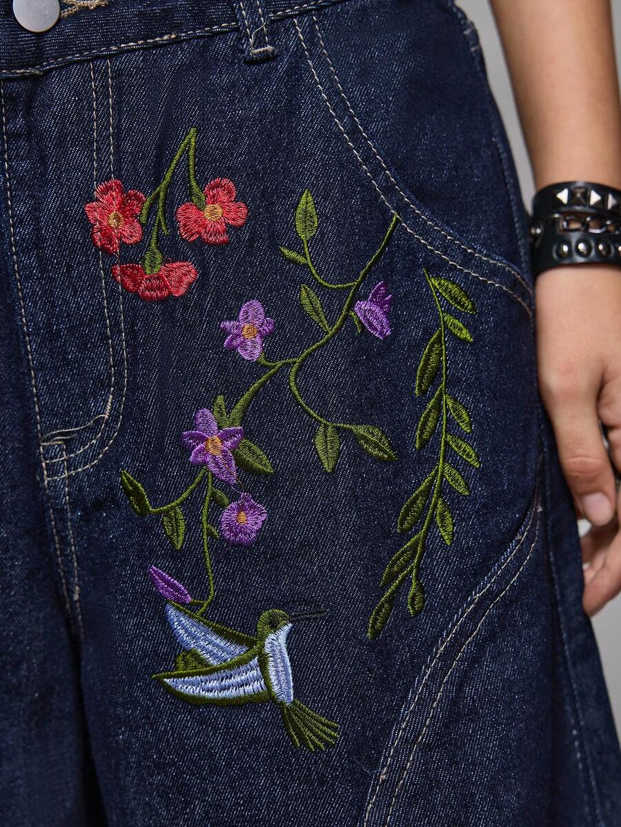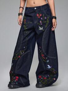 Grunge Punk Oversized Floral Embroidered Bagging Super Low Waist Jeans, Street Fashion