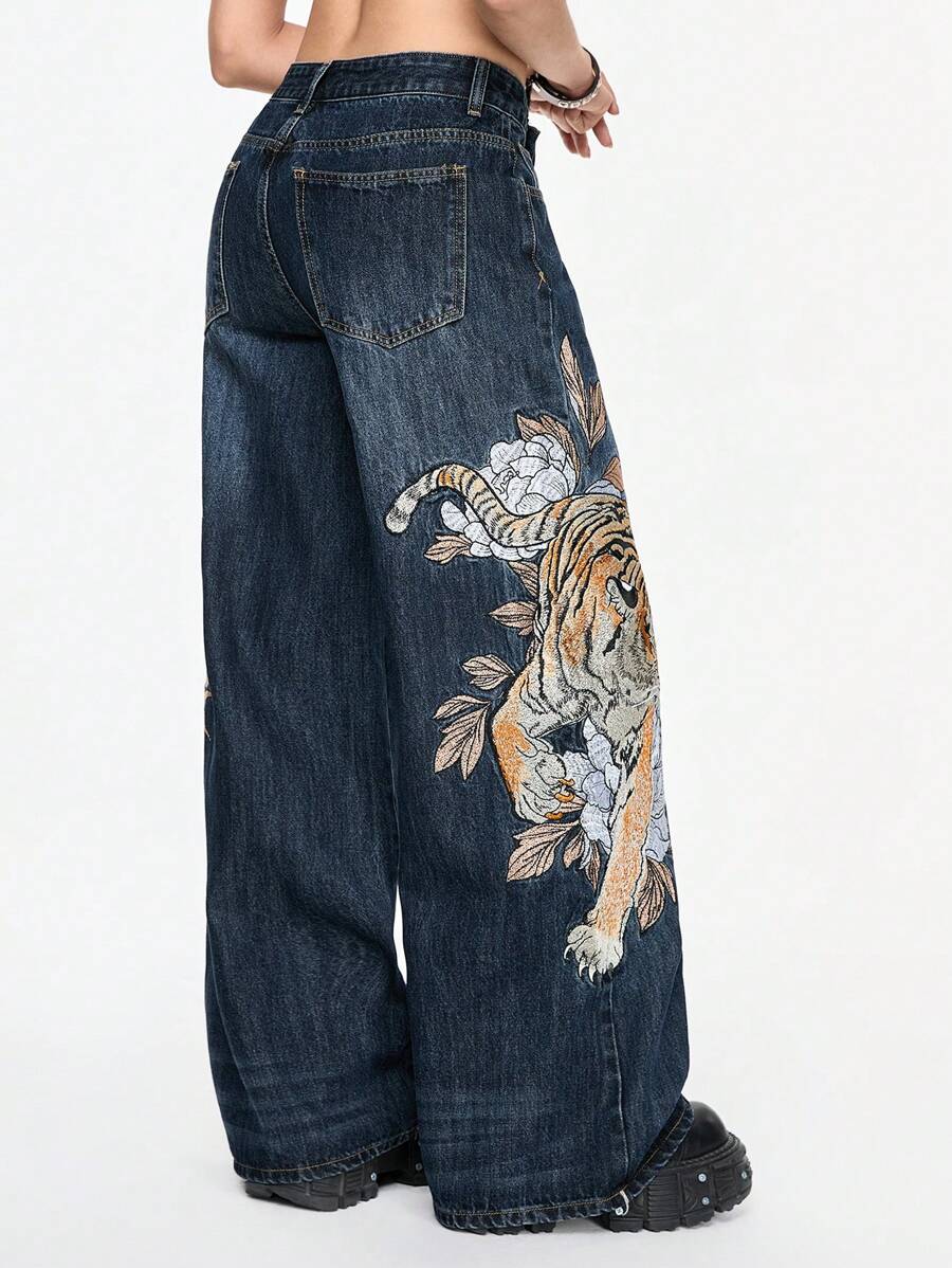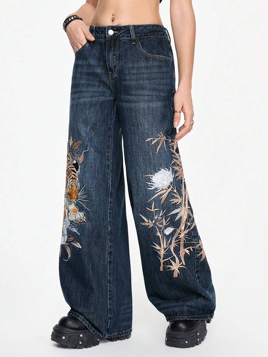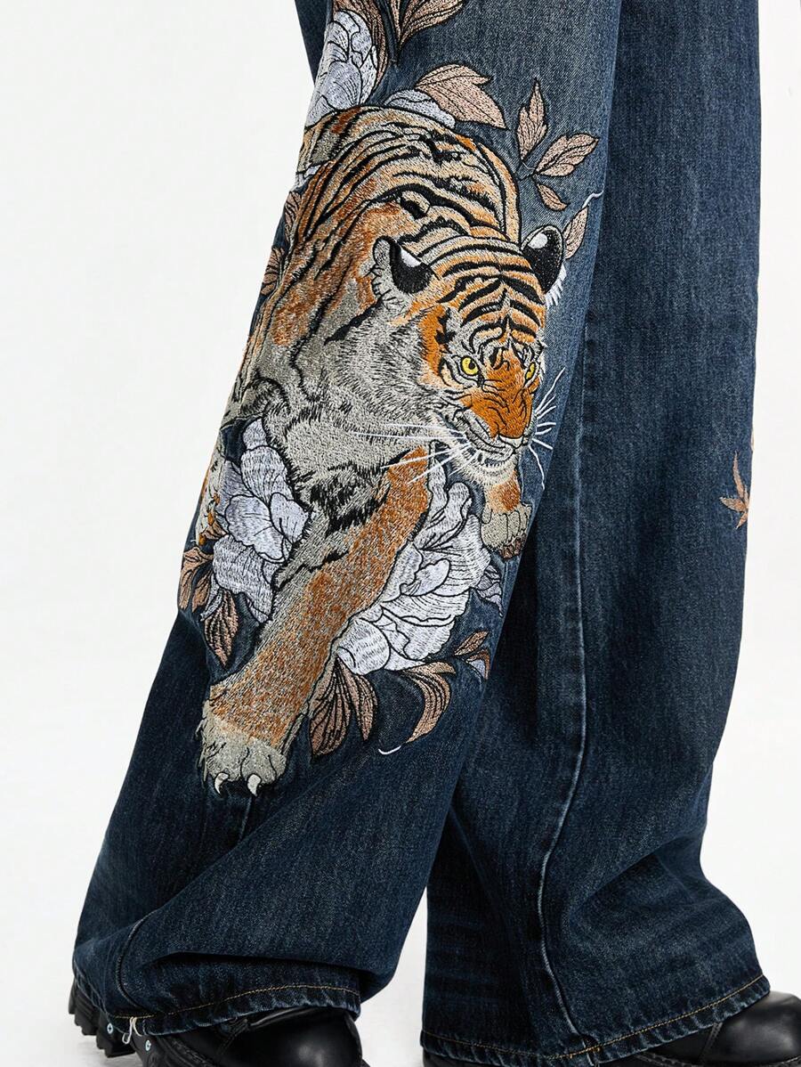 PETITE Unisex Retro Street-Style Chinese Tiger & Floral Embroidery Loose Wide-Leg Jeans