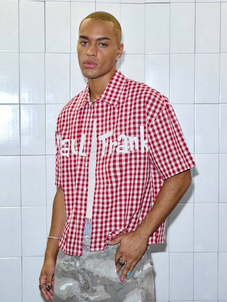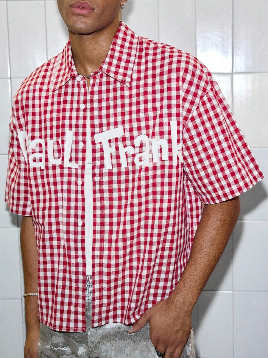 Paul Frank X ROMWE Men's Letter & Cartoon Pattern Plaid Short Sleeve Shirt