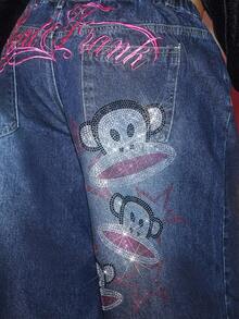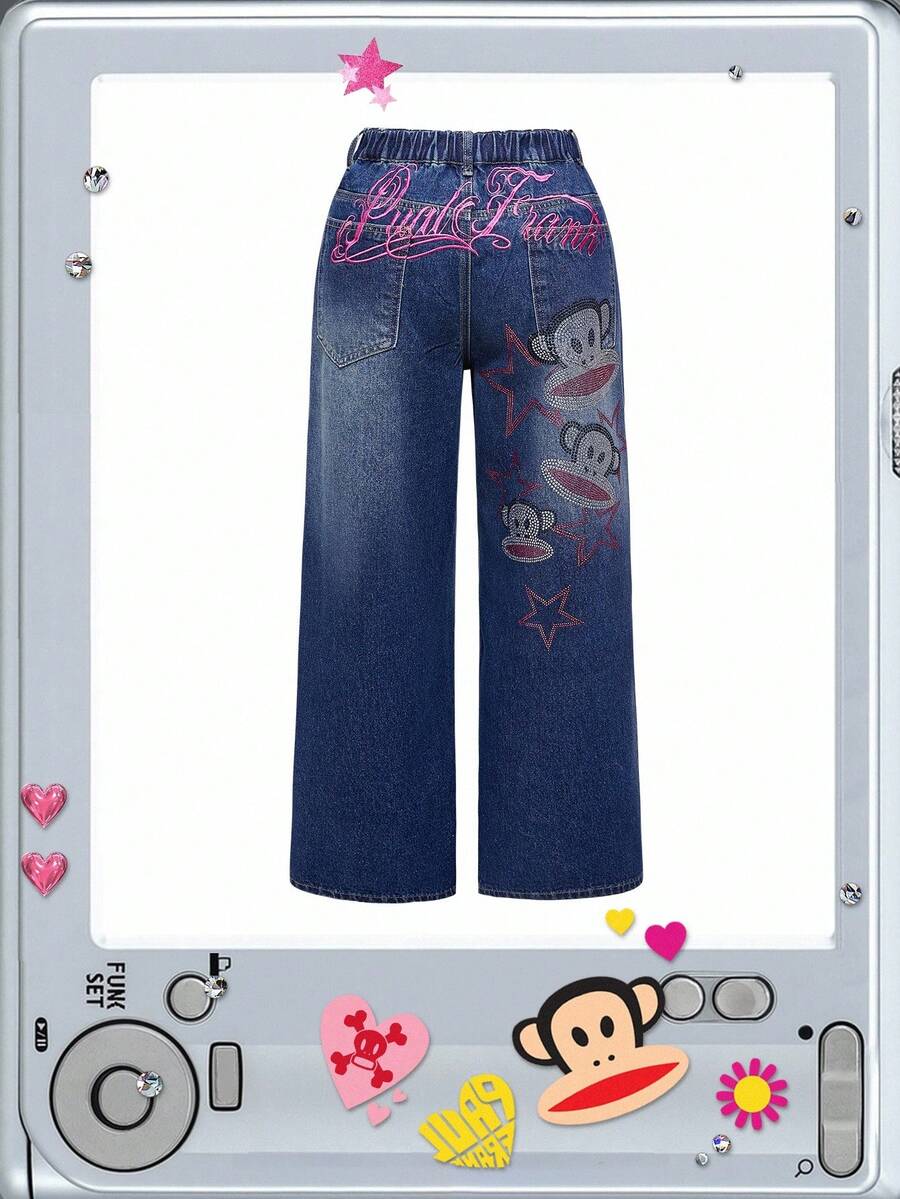 Paul Frank X ROMWE Plus Size Women Cartoon Pattern Rhinestone Decor Wide Leg Jeans