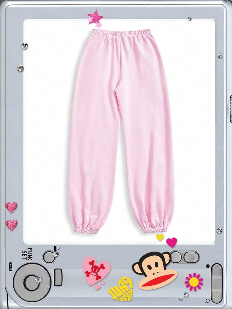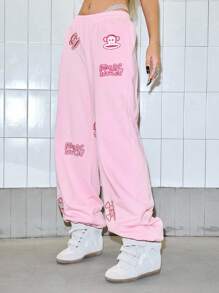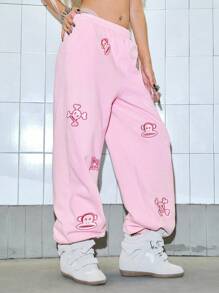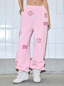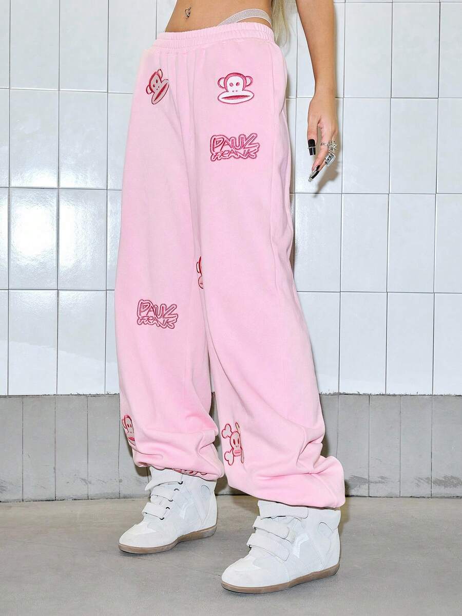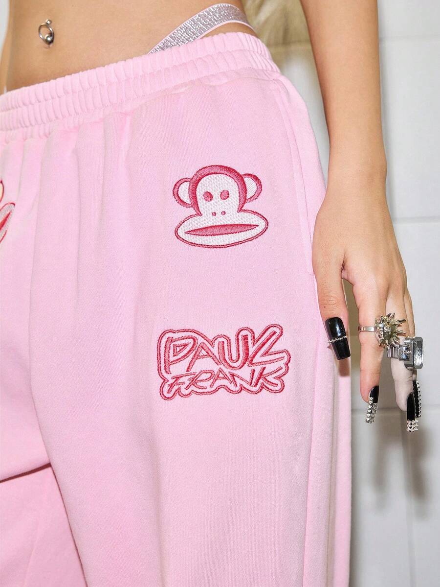 Paul Frank X ROMWE Women's Casual Letter & Monkey Embroidery Elastic Waist Pants