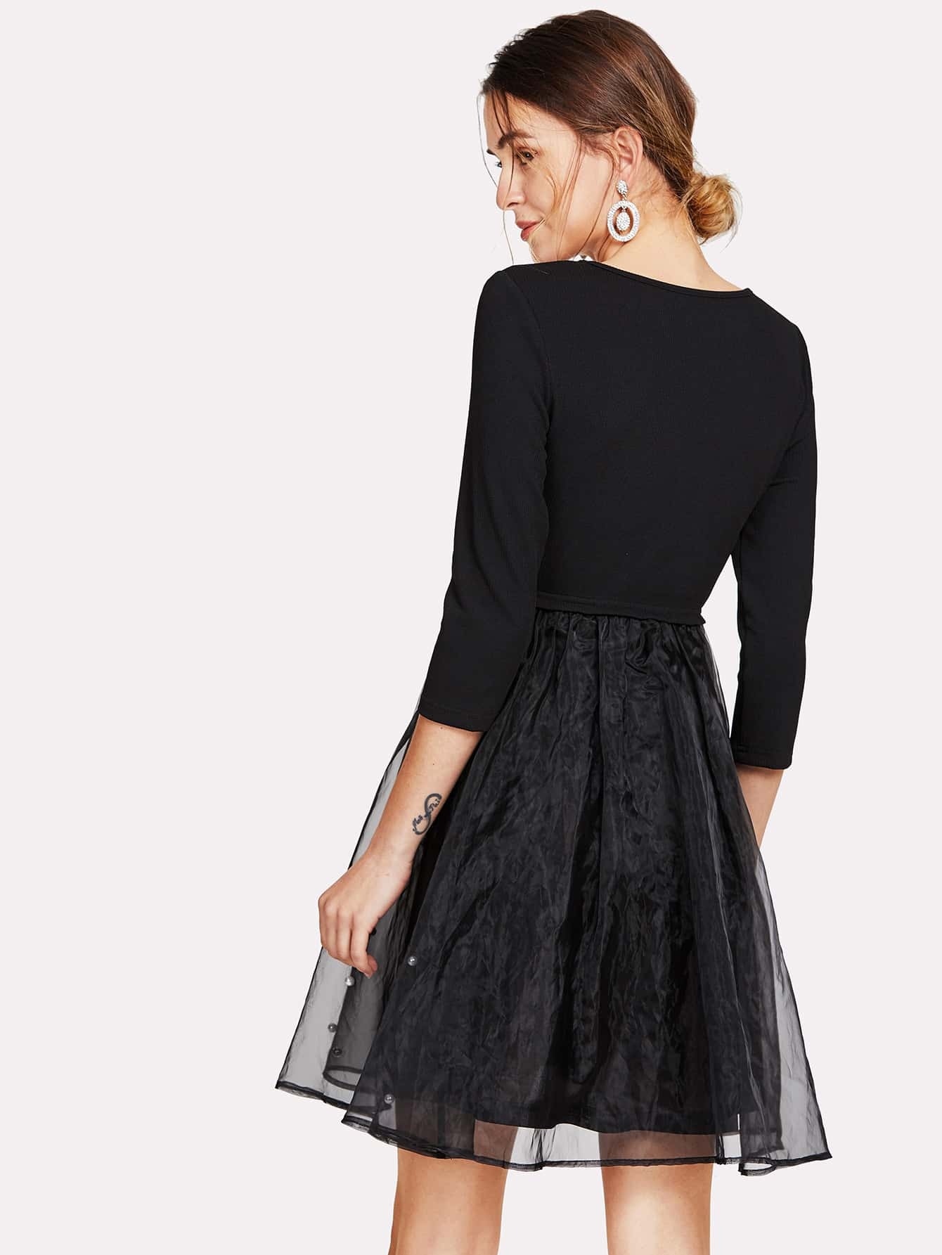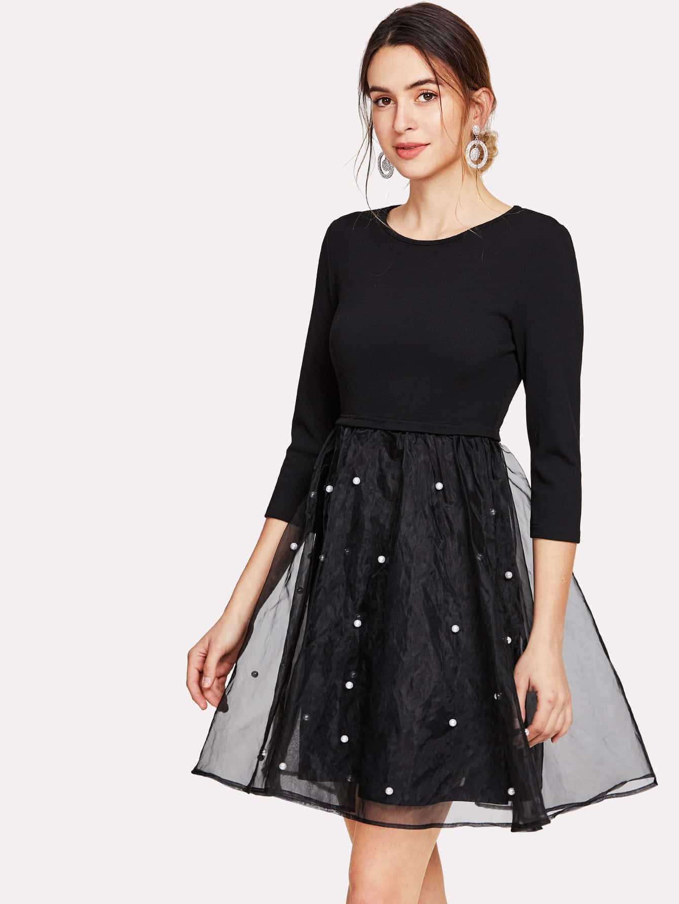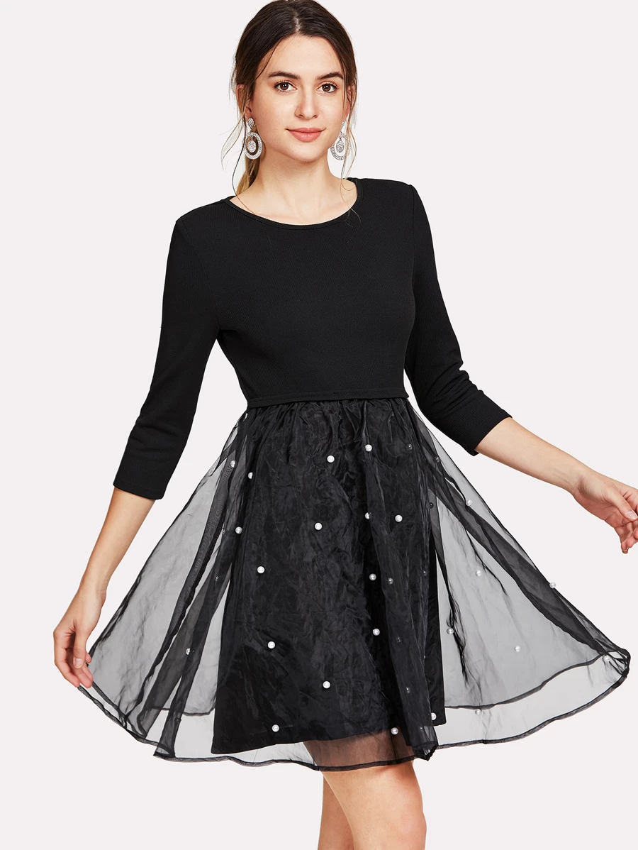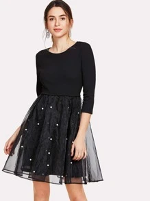 Pearl Beaded Mesh Overlay Fit & Flare Dress