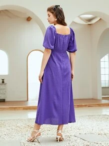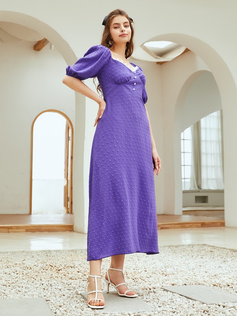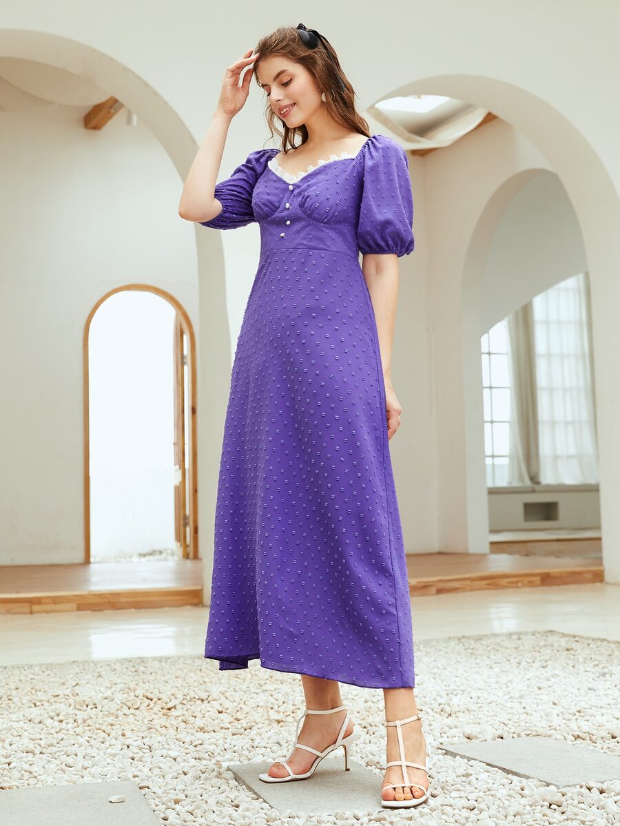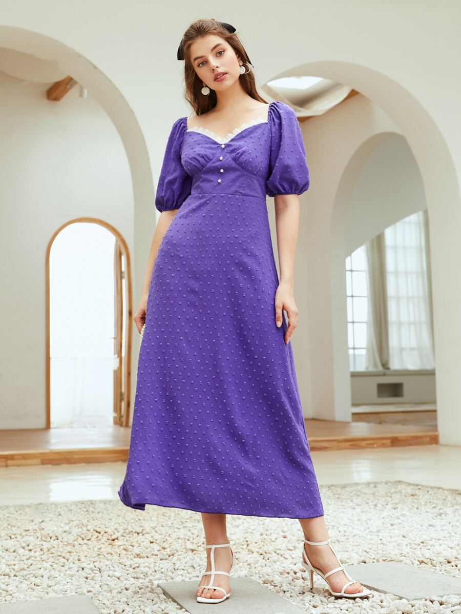 Pearls Sweetheart Neckline Puff Sleeve Swiss Dot A-line Dress