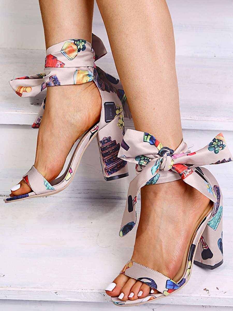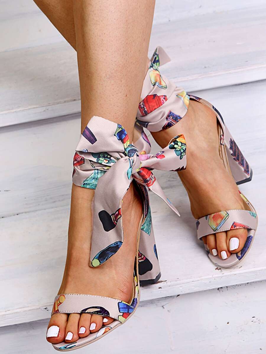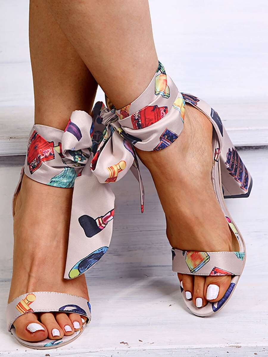 Perfume Print Tie Leg Design Chunky Heeled Sandals