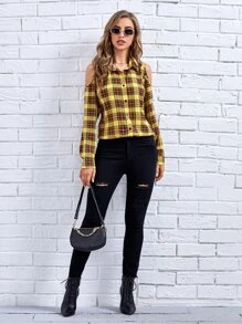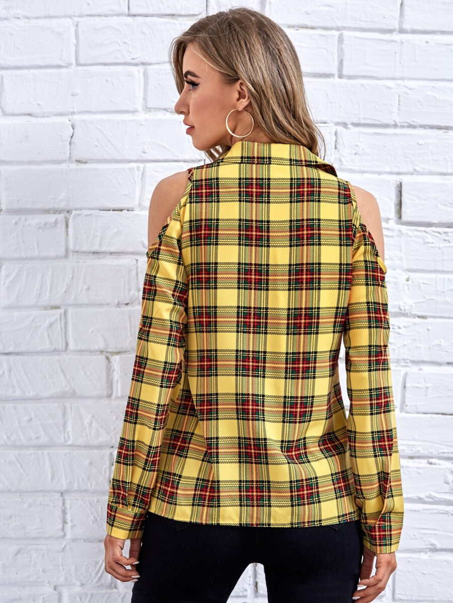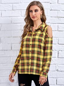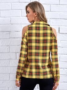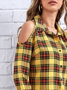Plaid Cold Shoulder Button Up Blouse