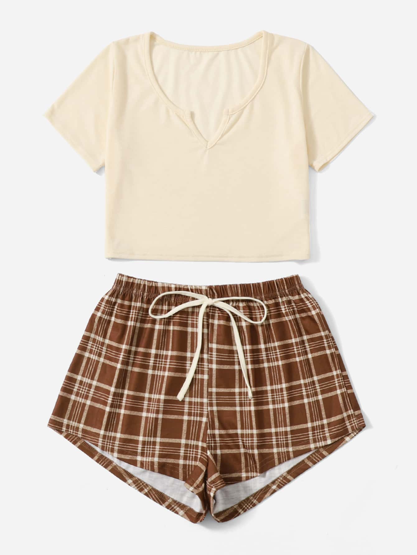 Plaid Knot Notched Neck Pajama Set