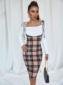 Plaid Tie Shoulder Suspender Dress Without Tee