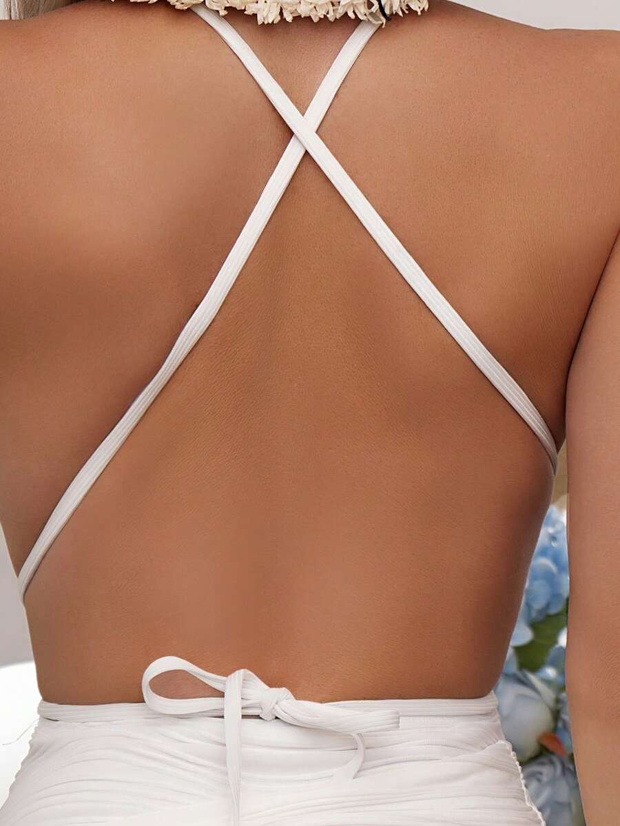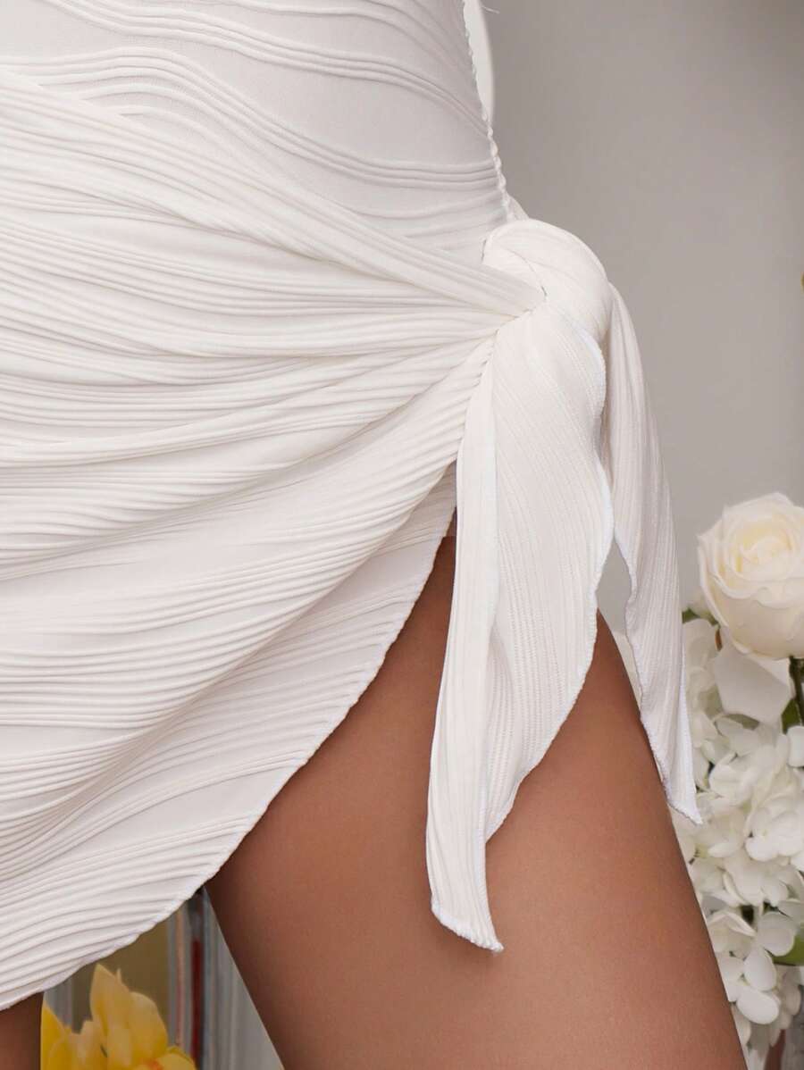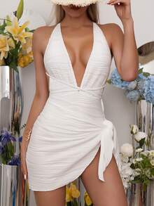 Plain Plunging One Piece Swimsuit With Beach Skirt