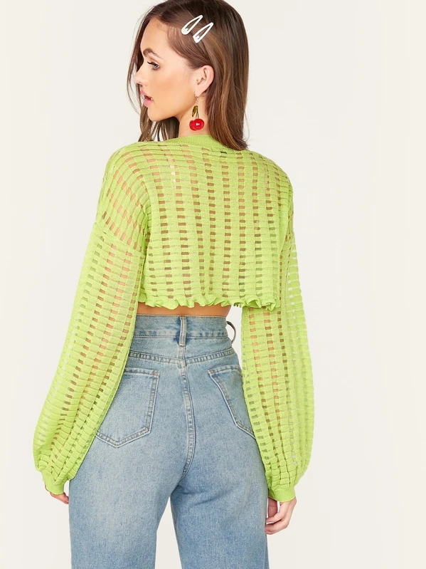Plunging Neck Tie Front Sheer Mesh Insert Crop Cardigan