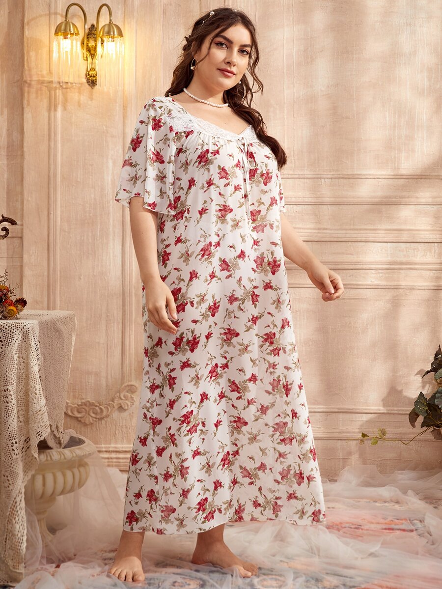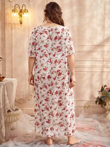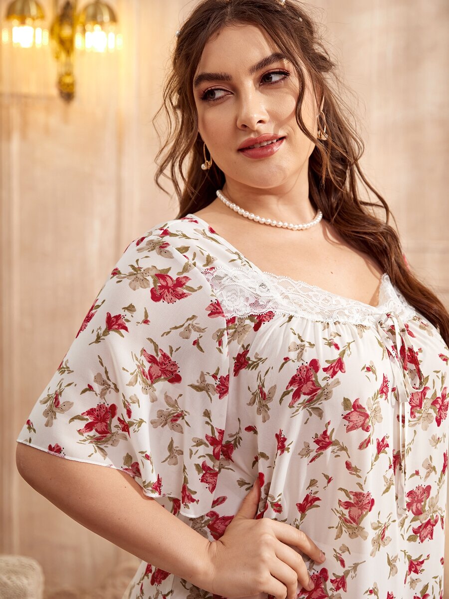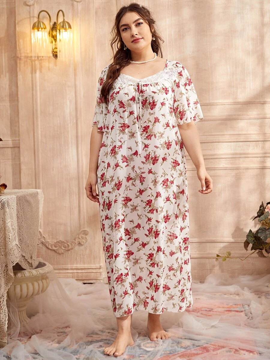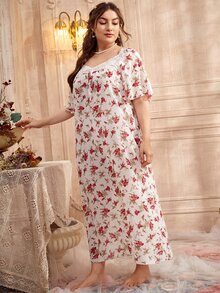 Plus All Over Floral Print Sweetheart Neck Contrast Lace Night Dress
