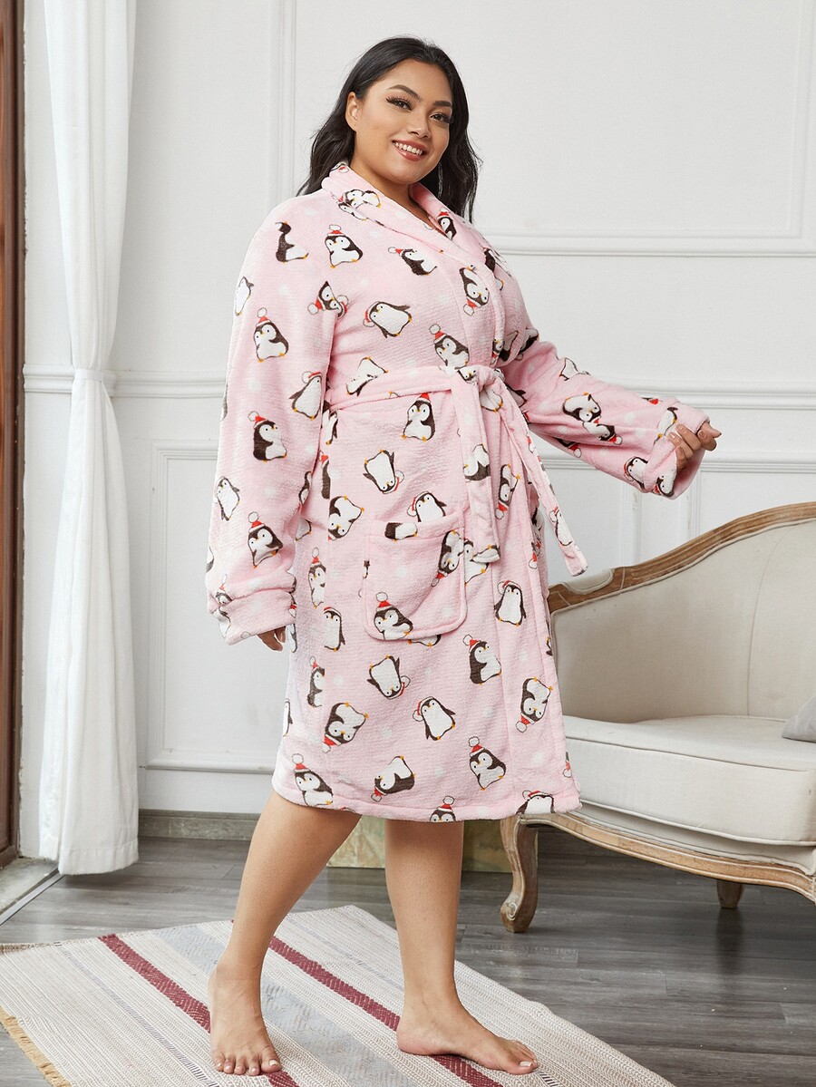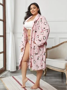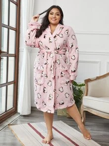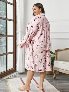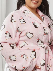 Plus Allover Cartoon Penguin Belted Flannel Robe