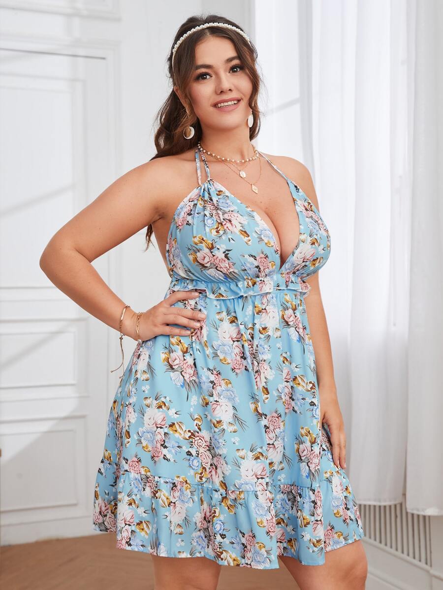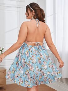 Plus Allover Floral Print Halter Neck Backless Knot Ruffle Hem Dress