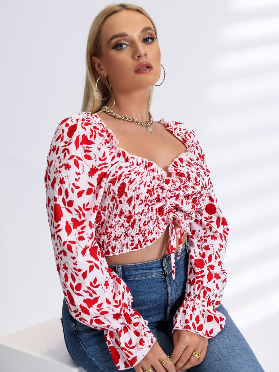 Plus Allover Plants Print Drawstring Front Flounce Sleeve Crop Shirred Top