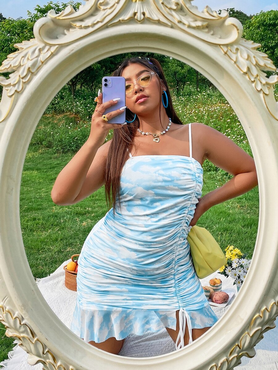 Plus Cloud Print Drawstring Ruffle Hem Mesh Cami Dress