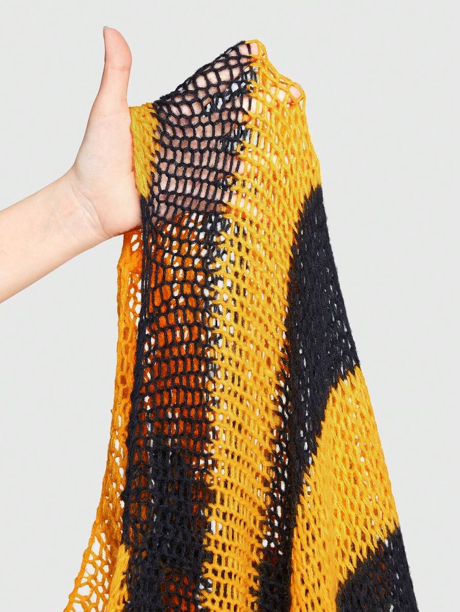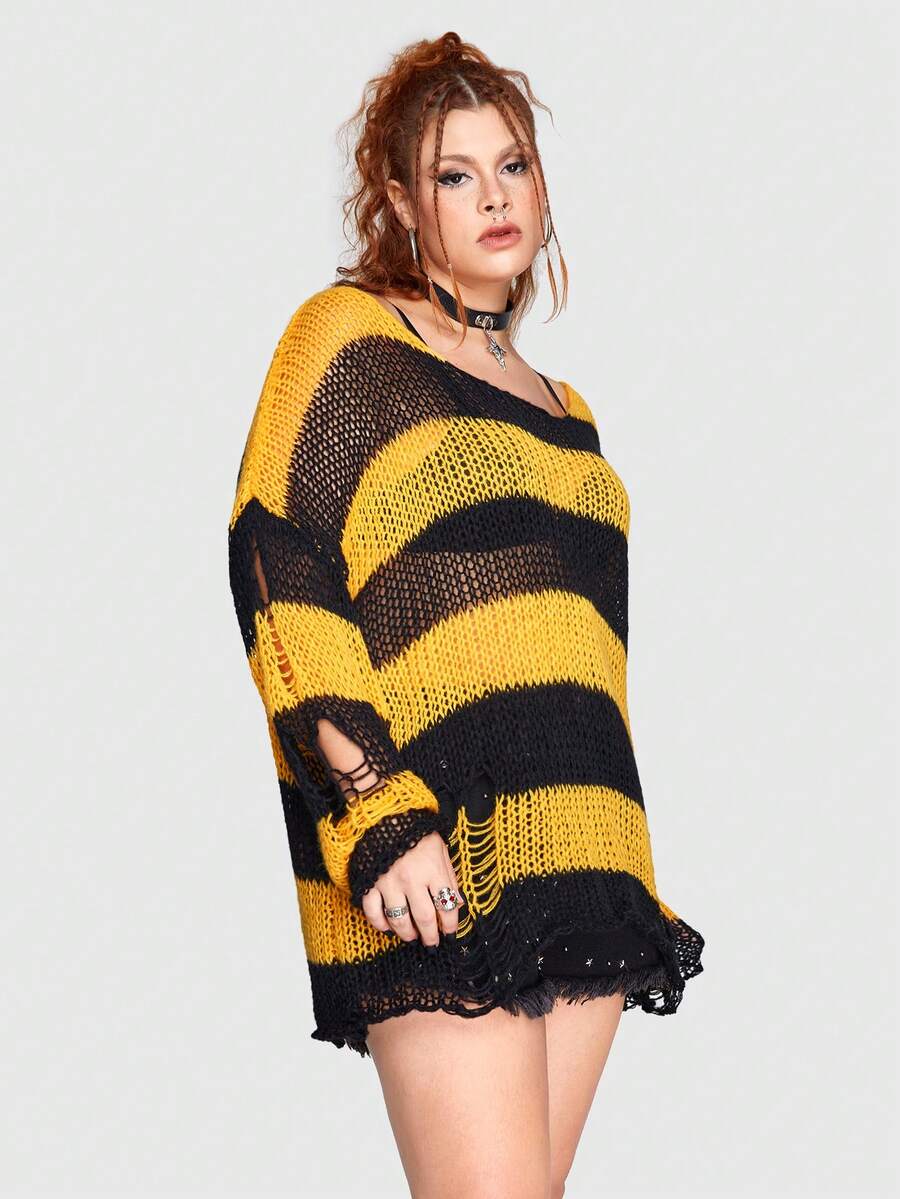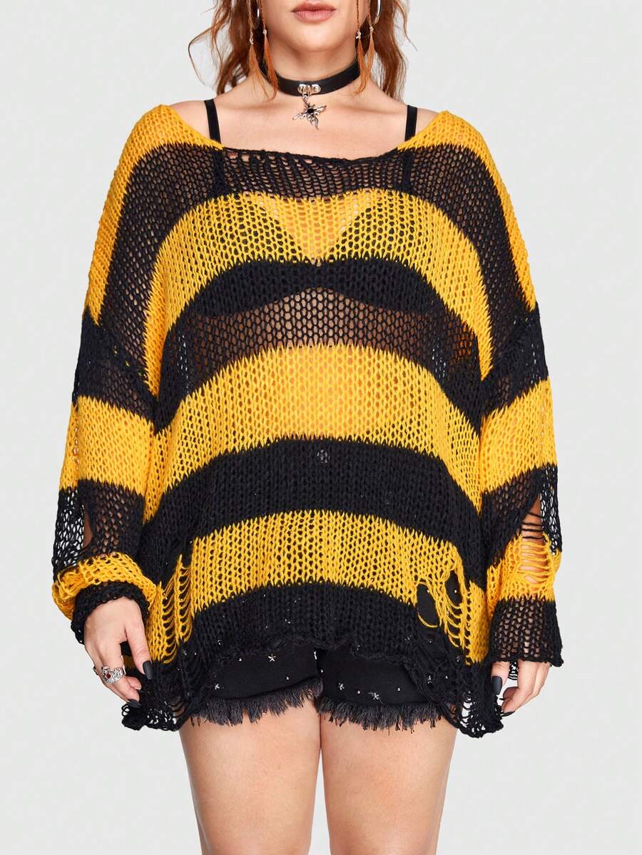Grunge Punk Plus Colorblock Drop Shoulder Distressed Sweater