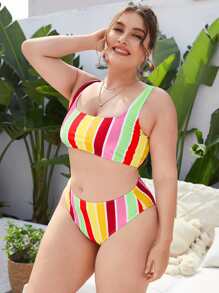Plus Size Colorblock Striped Bikini Set Summer Beach