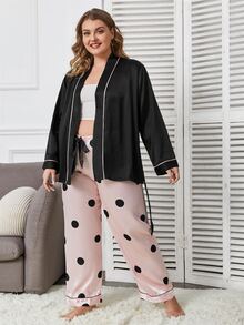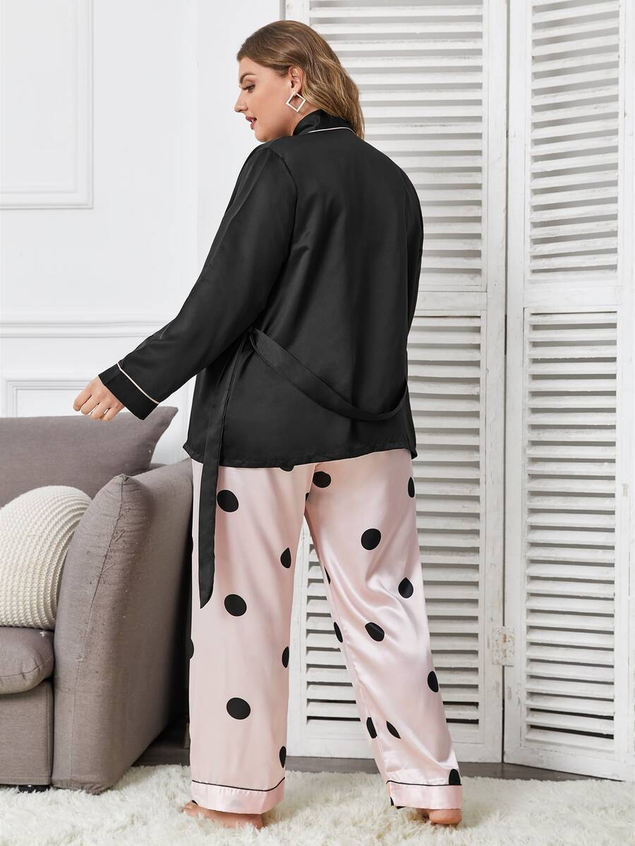 Plus Contrast Binding Belted Top & Polka Dot Pants Pajama Set