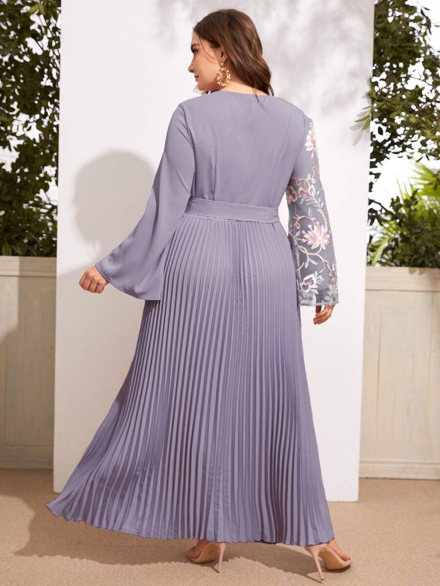 Plus Contrast Floral Embroidered Mesh Belted Pleated Dress