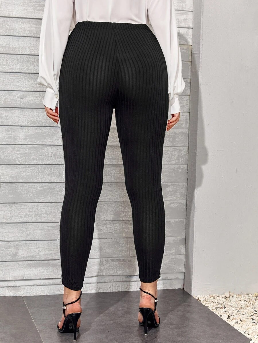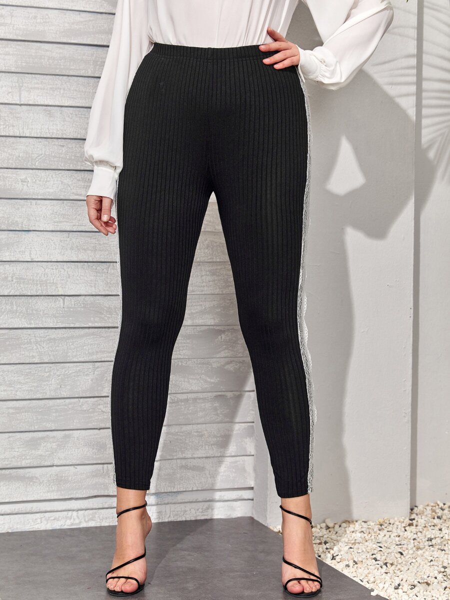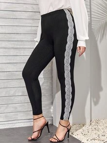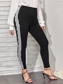 Plus Contrast Lace Panel Side Rib-knit Leggings