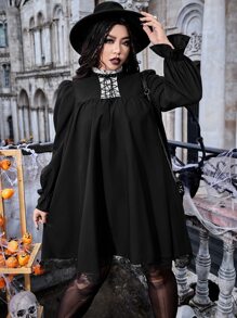 Plus Contrast Panel Frill Mock Neck Flounce Sleeve Lace Trim Dress