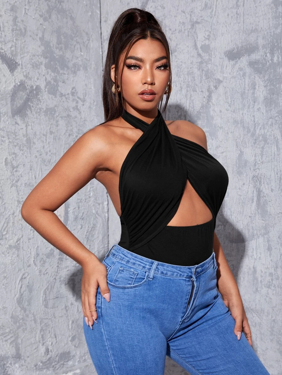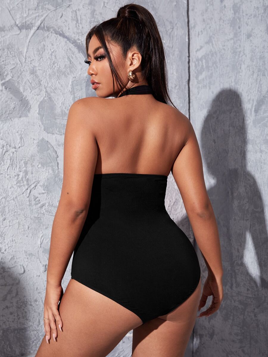 Plus Cross Wrap Backless Halter Bodysuit