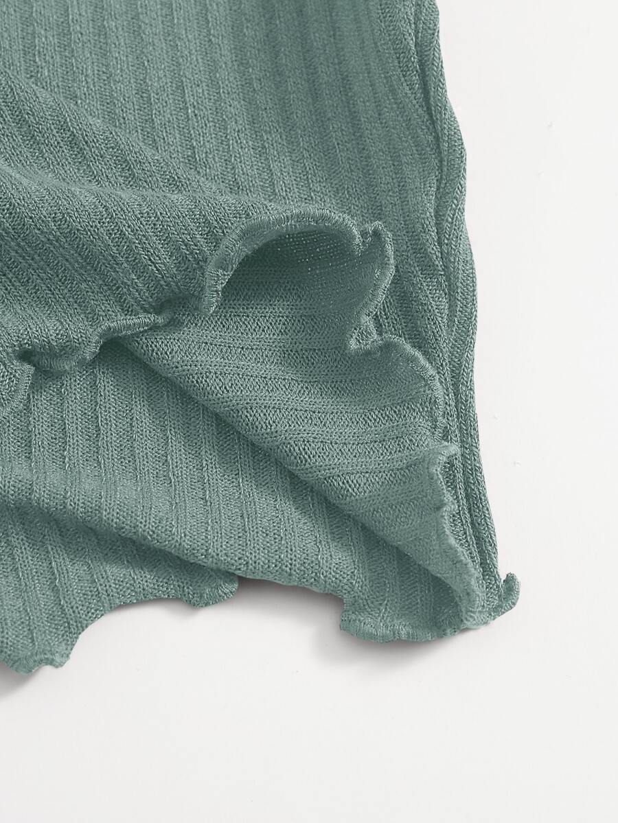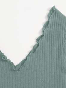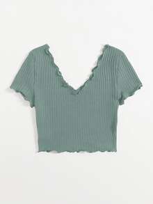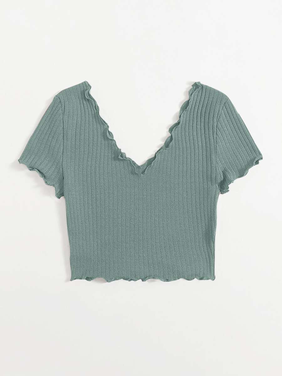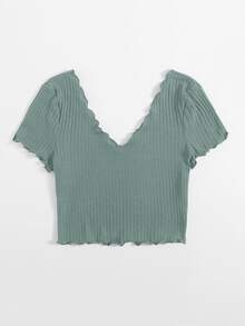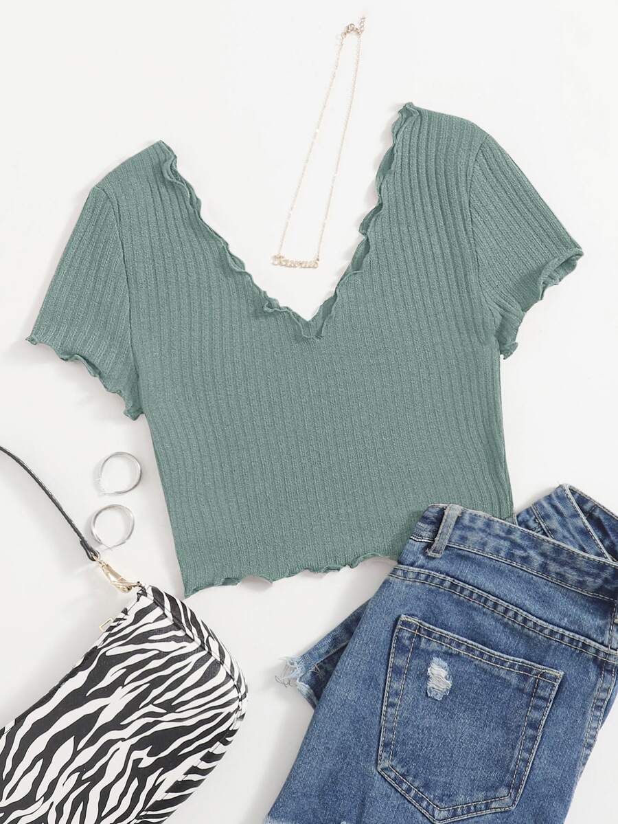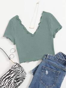Plus Double V-Neck Solid Lettuce Trim Rib-knit Tee