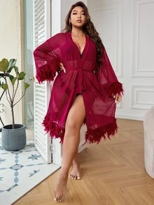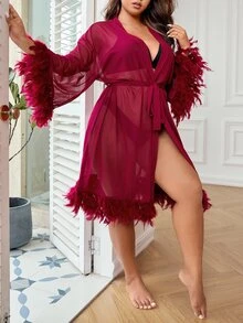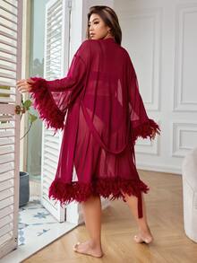 Plus Drop Shoulder Contrast Fur Trim Belted Mesh Robe Without Lingerie