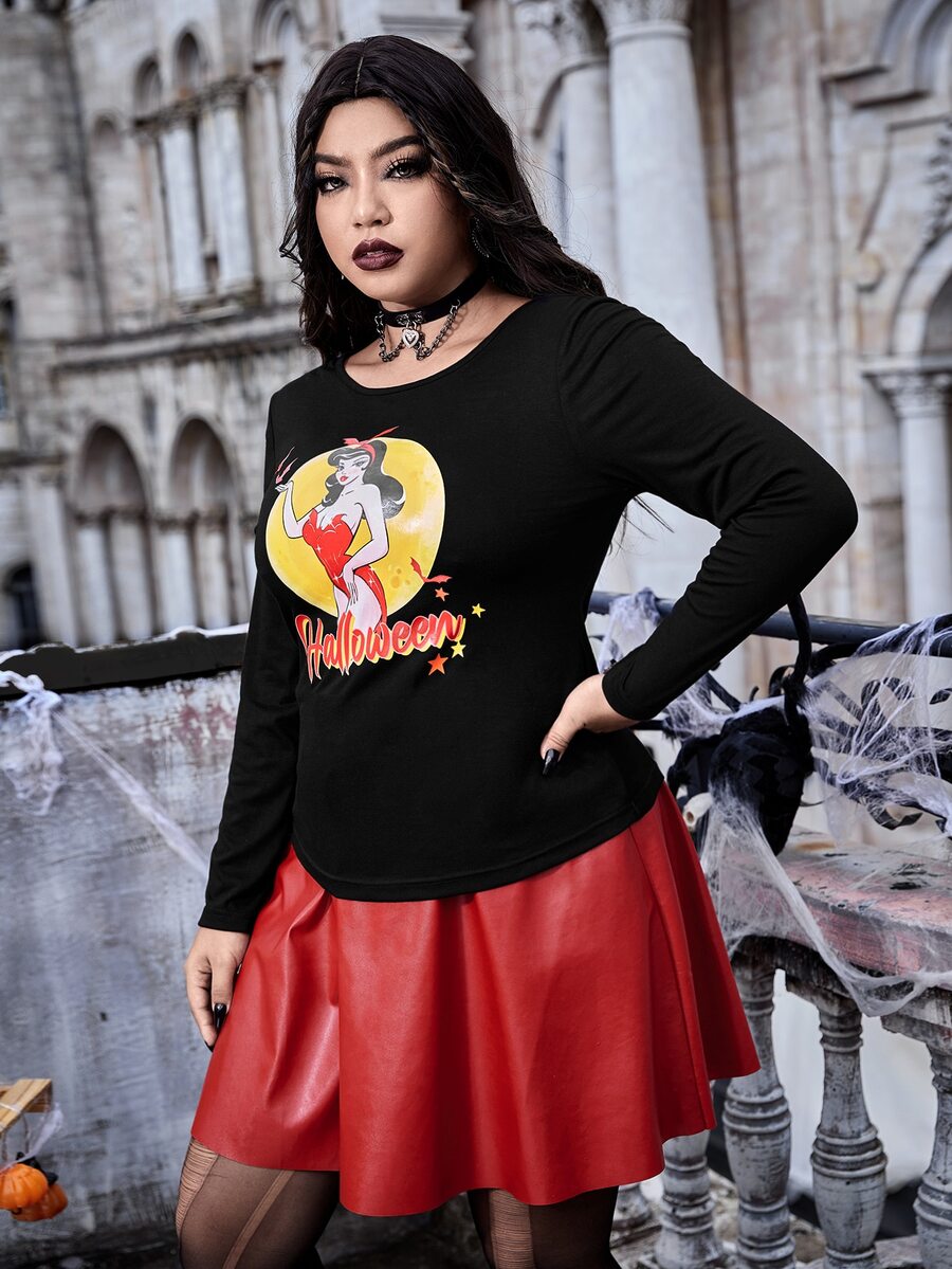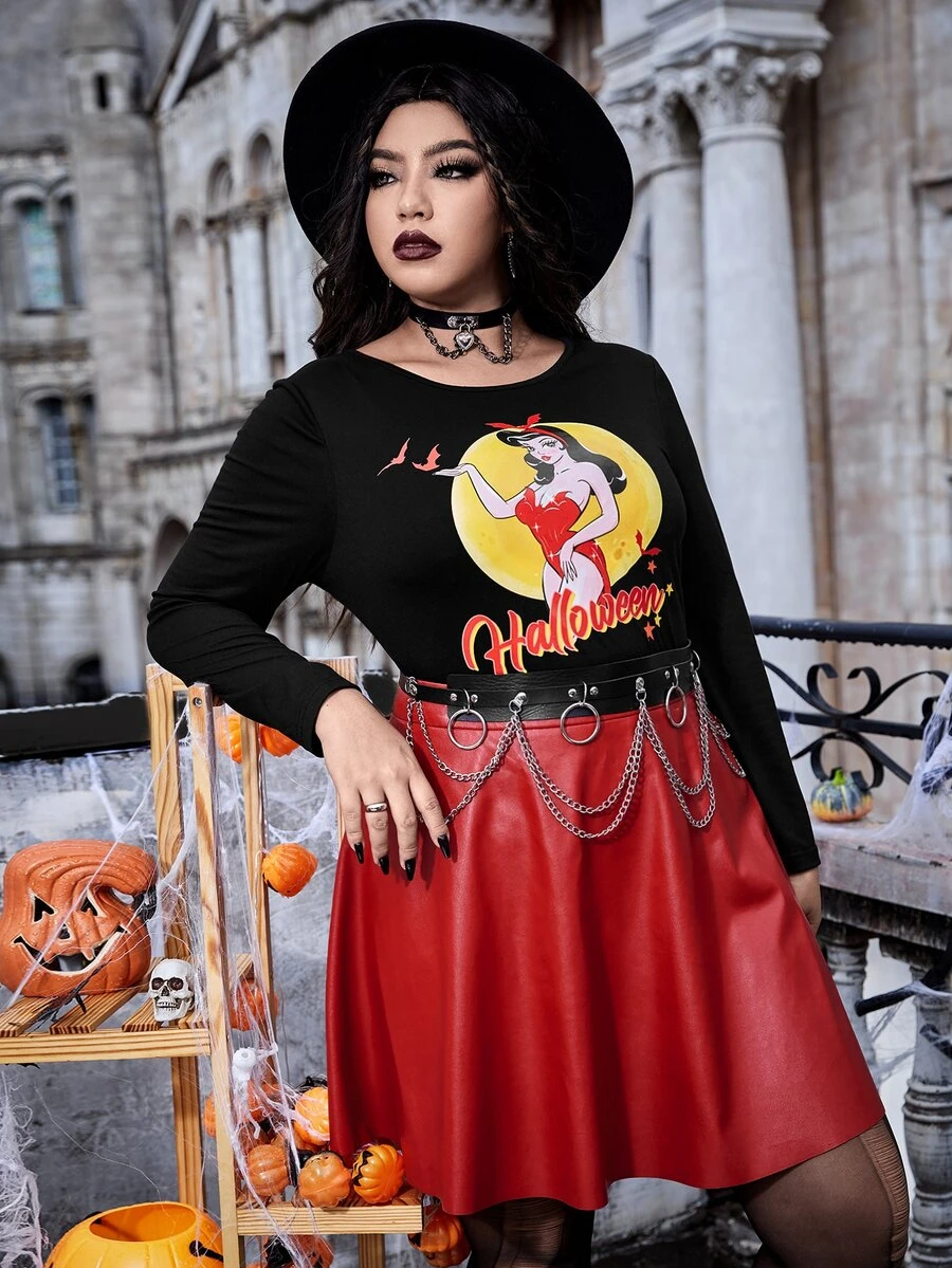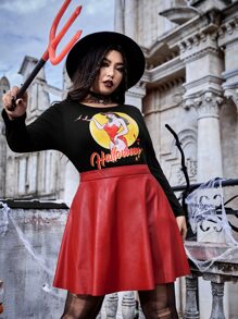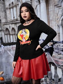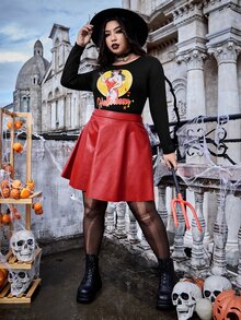 Plus Figure & Letter Graphic Tee & PU Leather Skirt