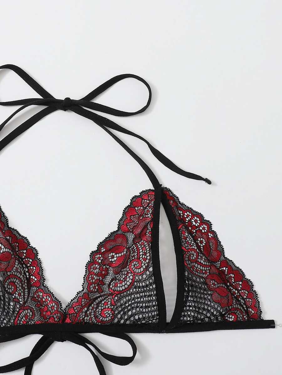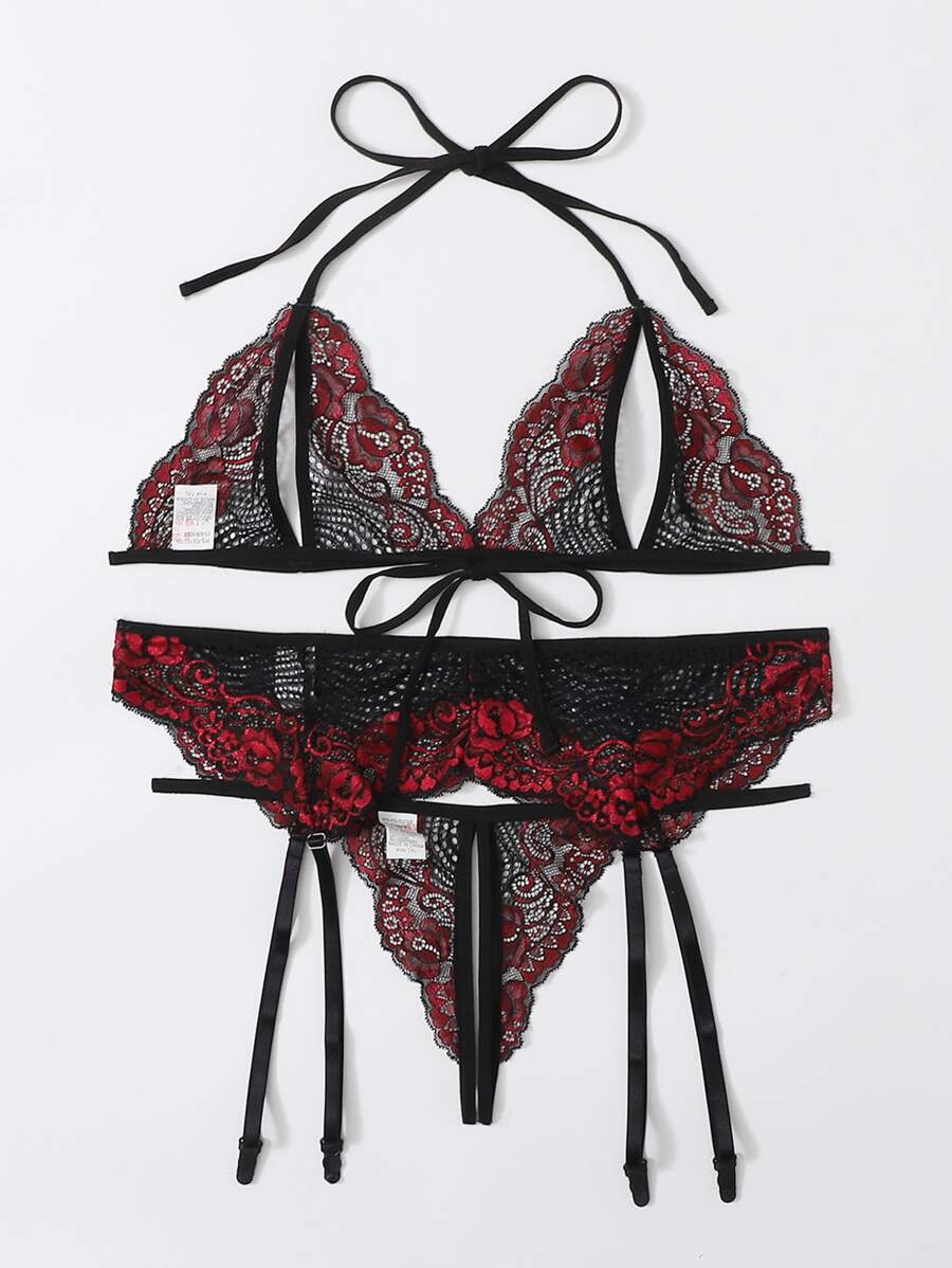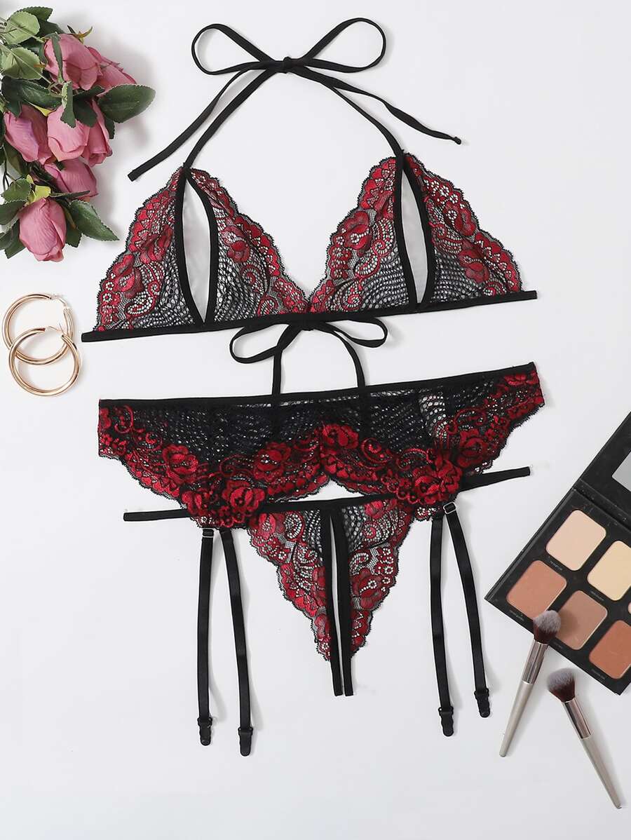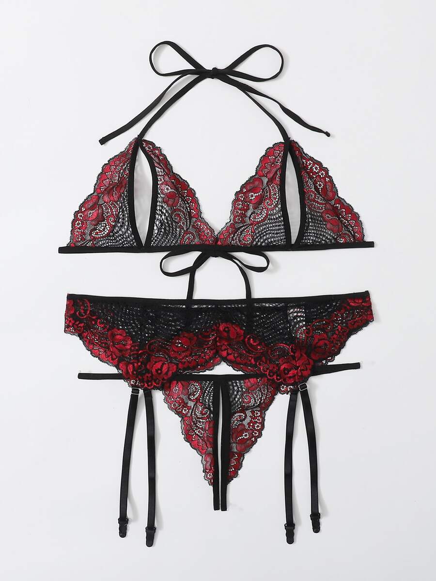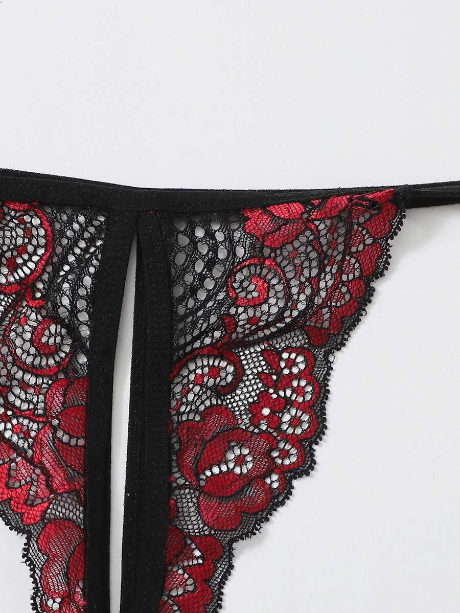 Plus Floral Lace Crotchless Garter Lingerie Set