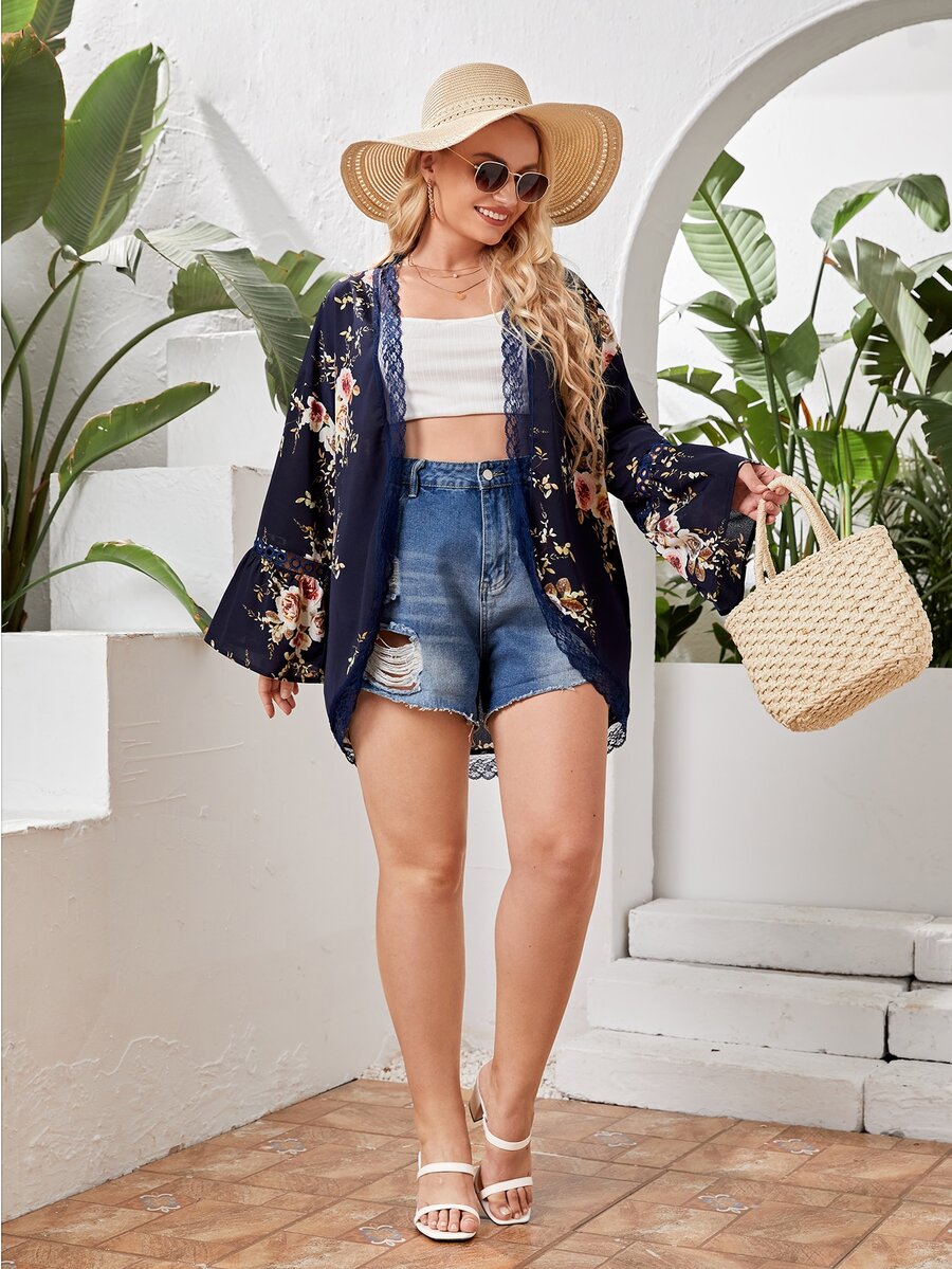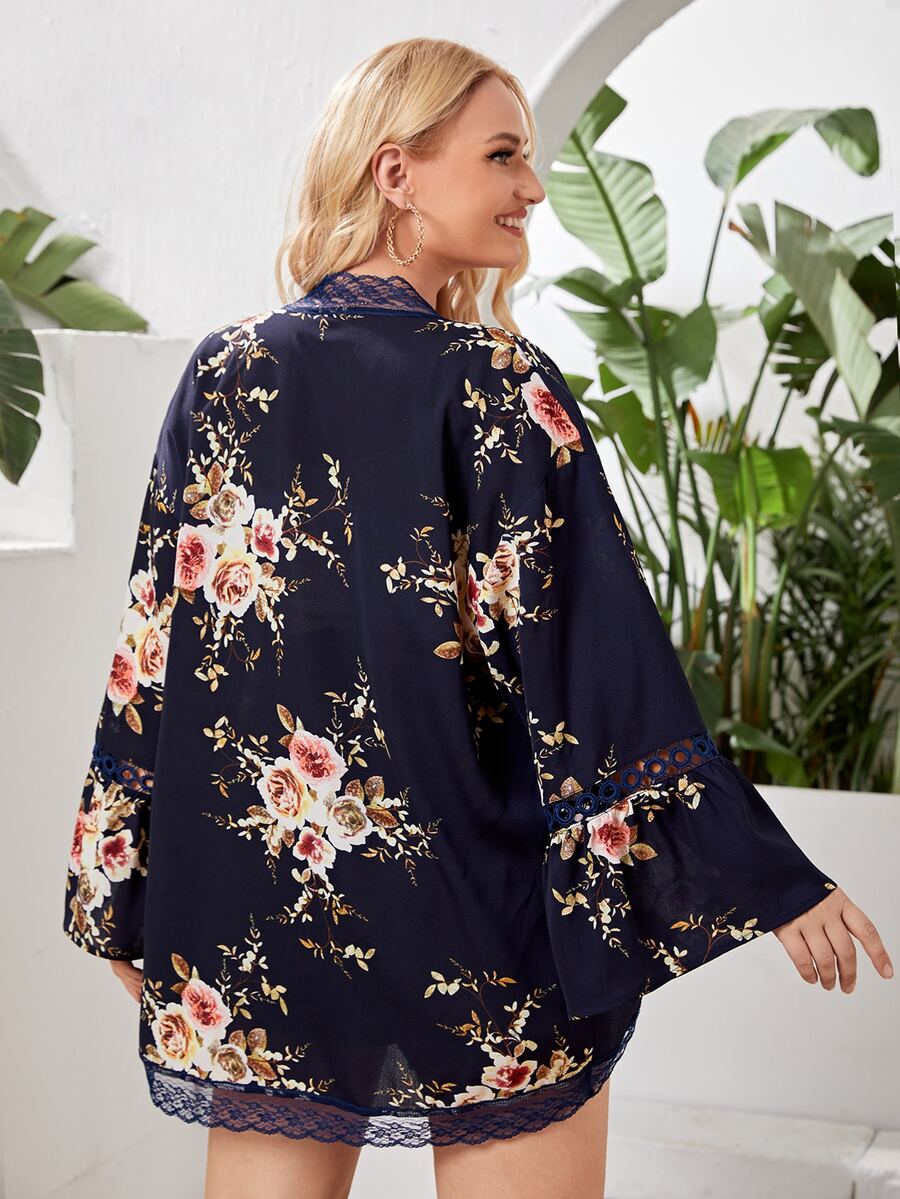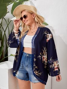 Plus Floral Lace Trim Kimono
