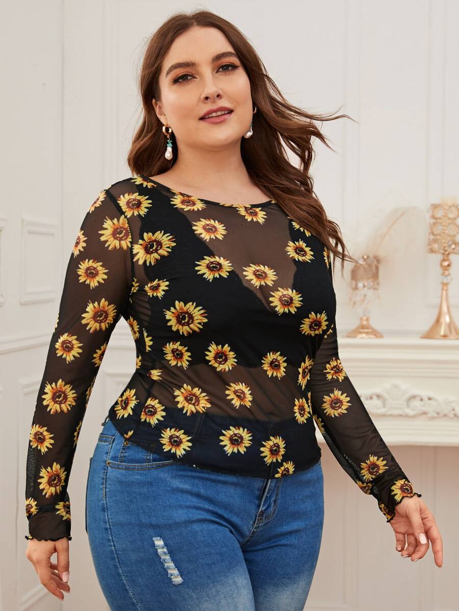Plus Floral Mesh Sheer Top Without Bra