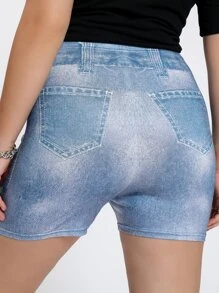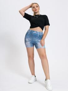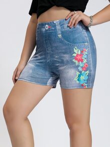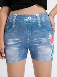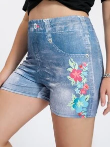 Plus Floral Print Denim Effect Biker Shorts