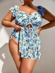 Plus Floral Print Drawstring Front Swim Dress With Bikini Bottom