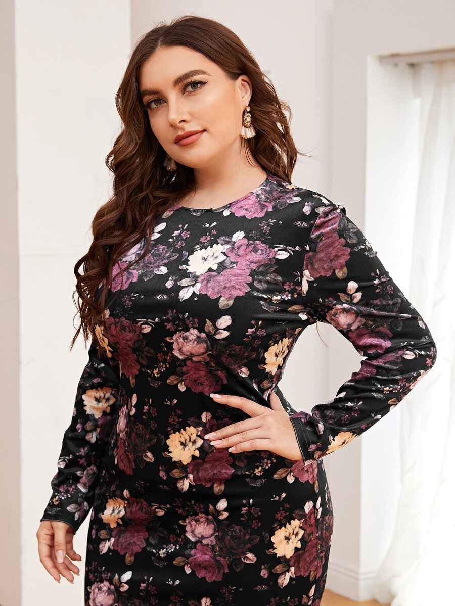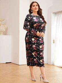 Plus Floral Print Velvet Bodycon Dress