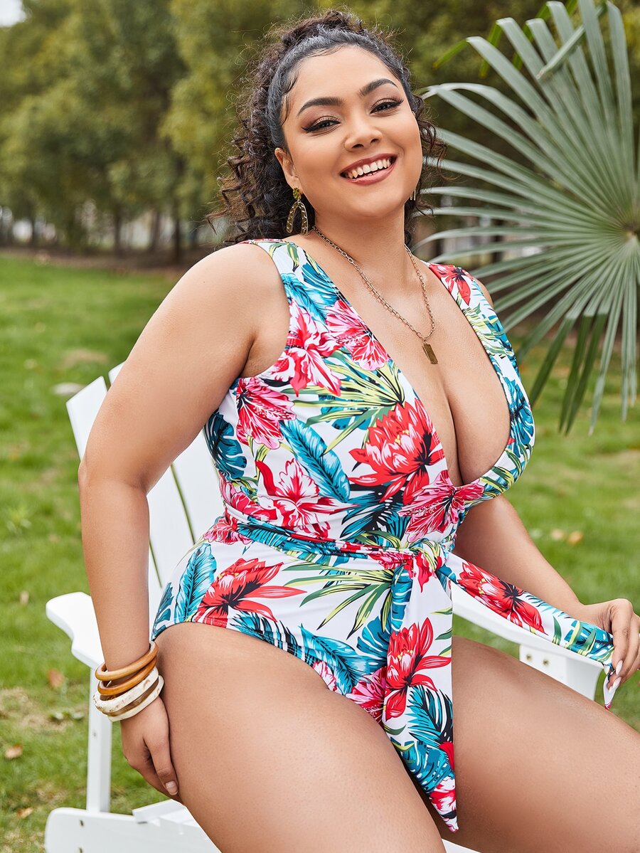 Plus Floral & Tropical Knot Front One Piece Swimsuit