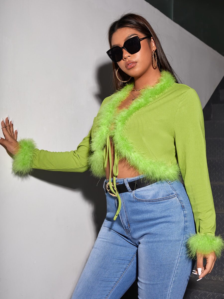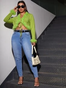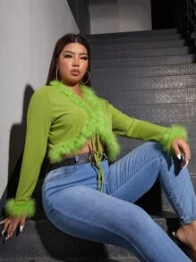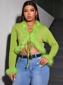Plus Fuzzy Trim Knot Front Crop Top