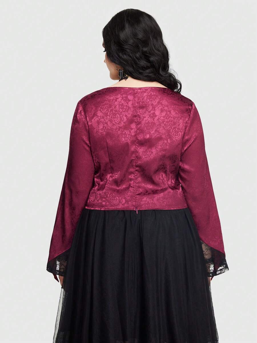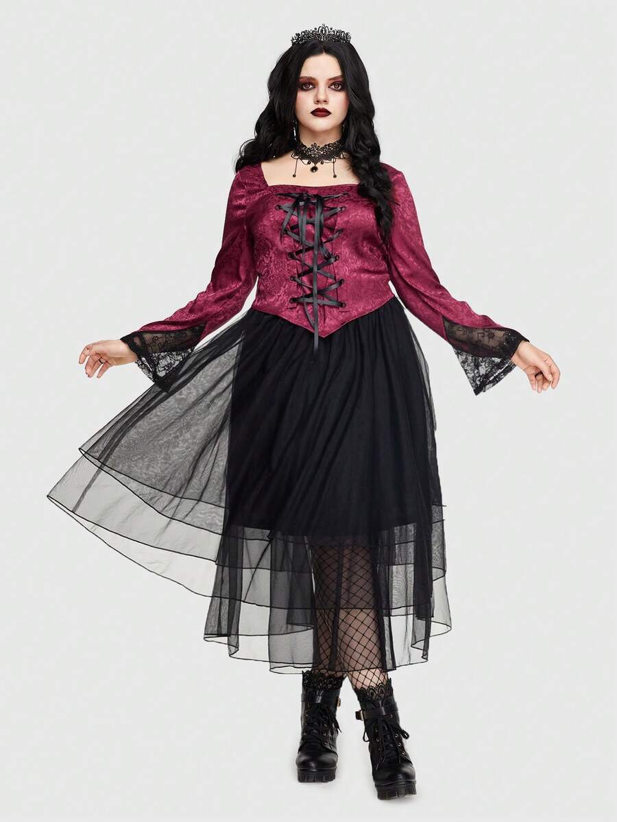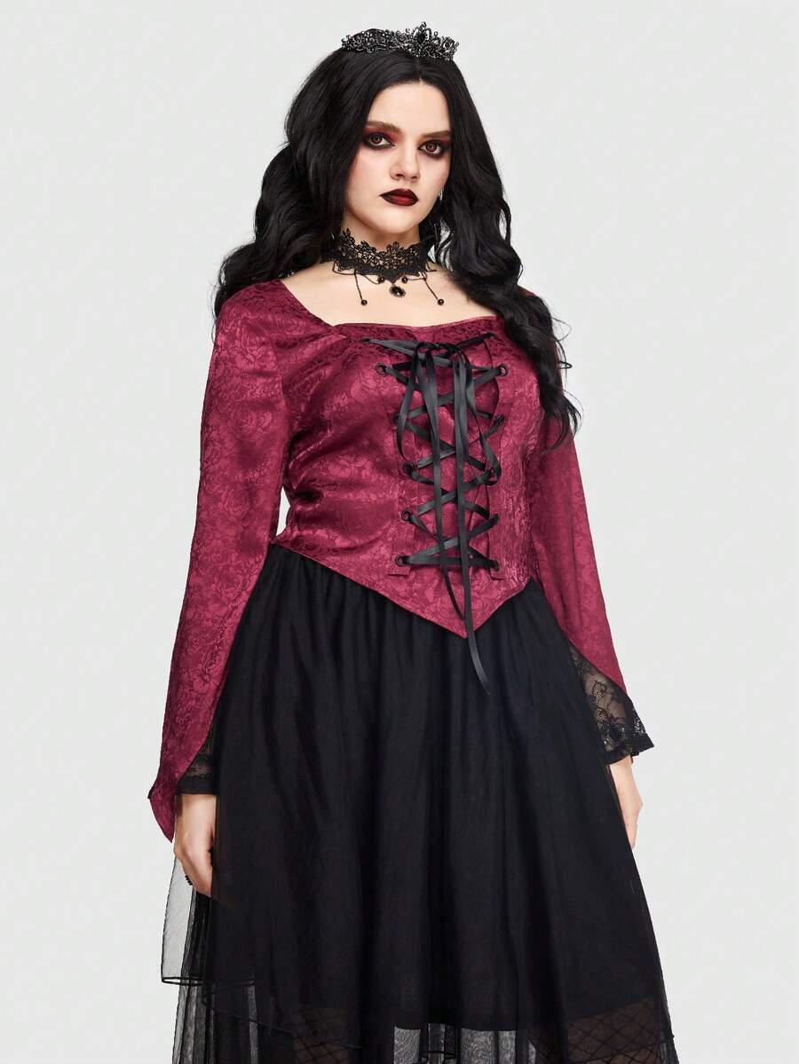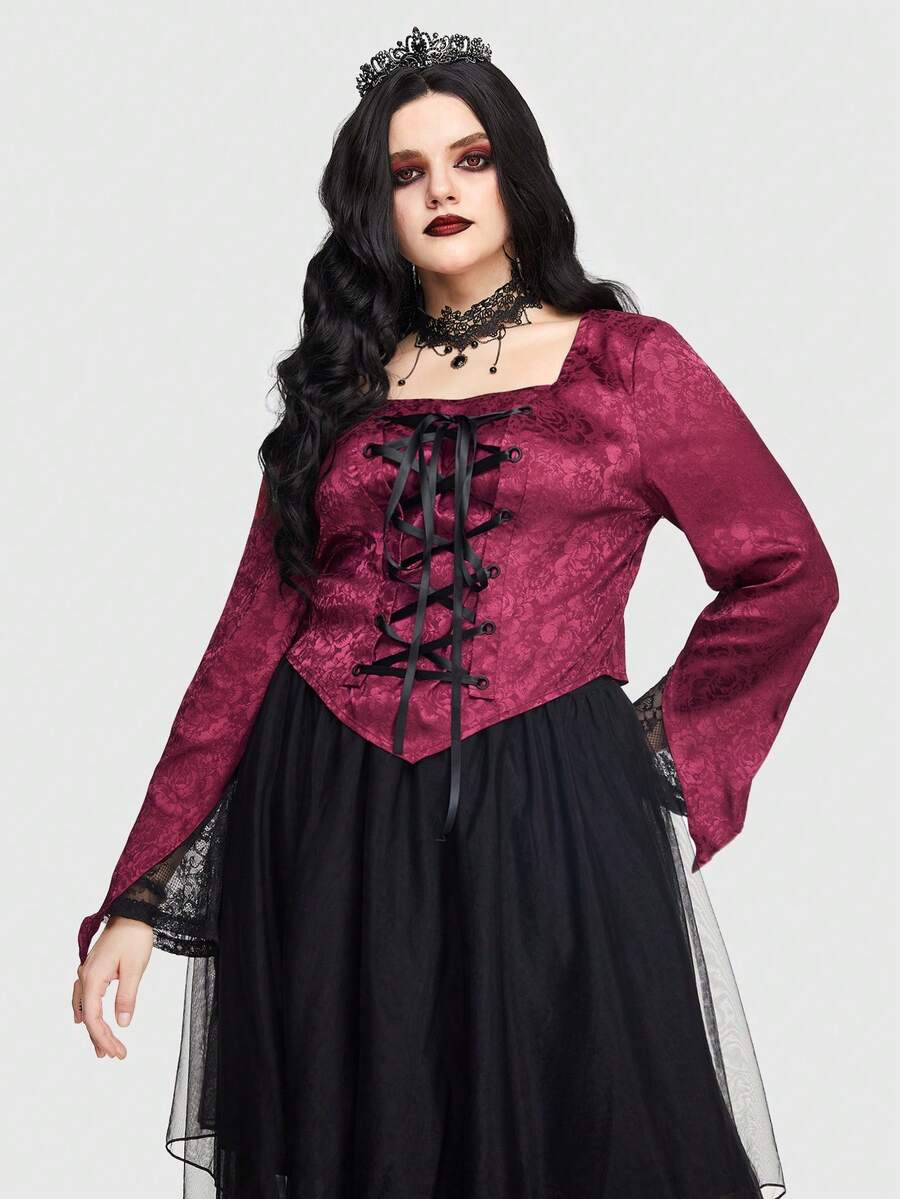 Plus Lace Up Front Contrast Mesh Lace Up Front Velvet Blouse