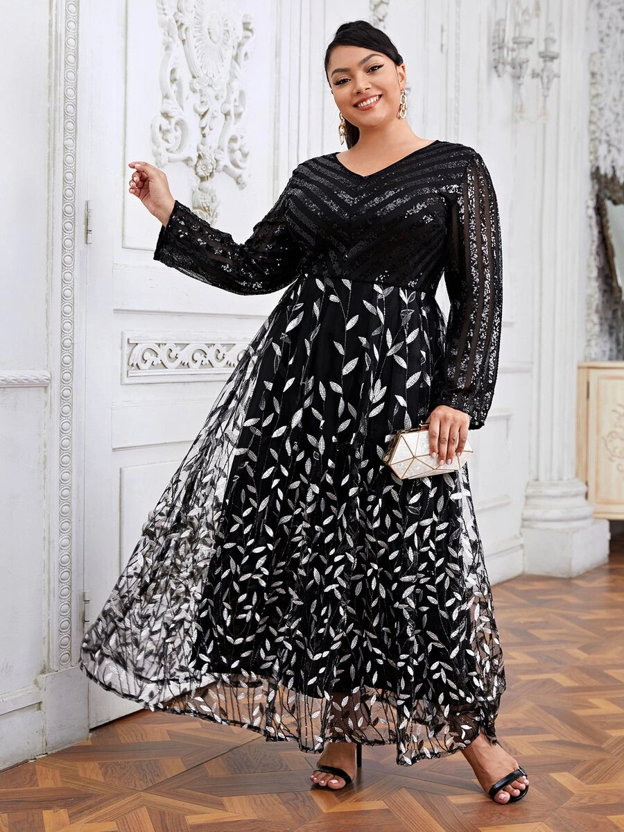 Plus Leaf Embroidery Contrast Sequin Mesh Maxi Prom Dress