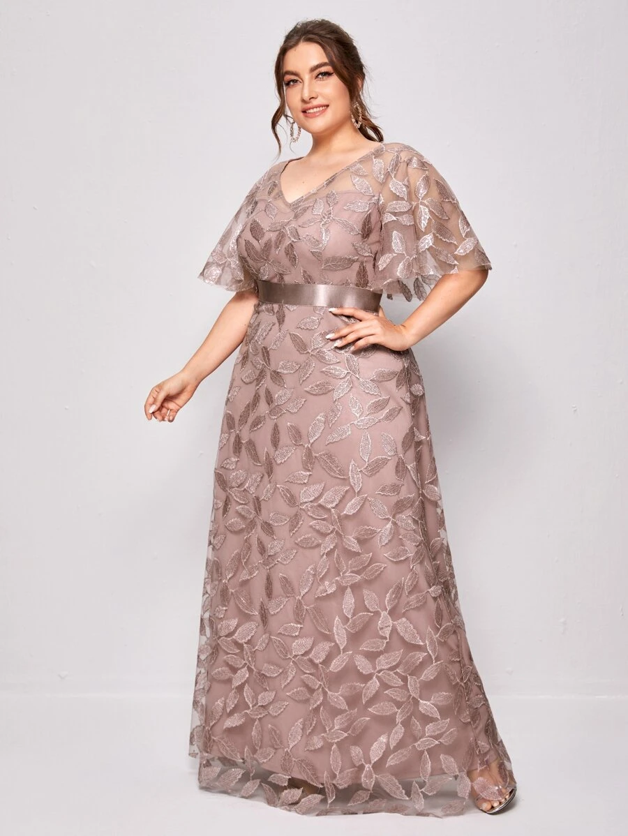 Plus Leaf Embroidery Mesh Overlay Dress