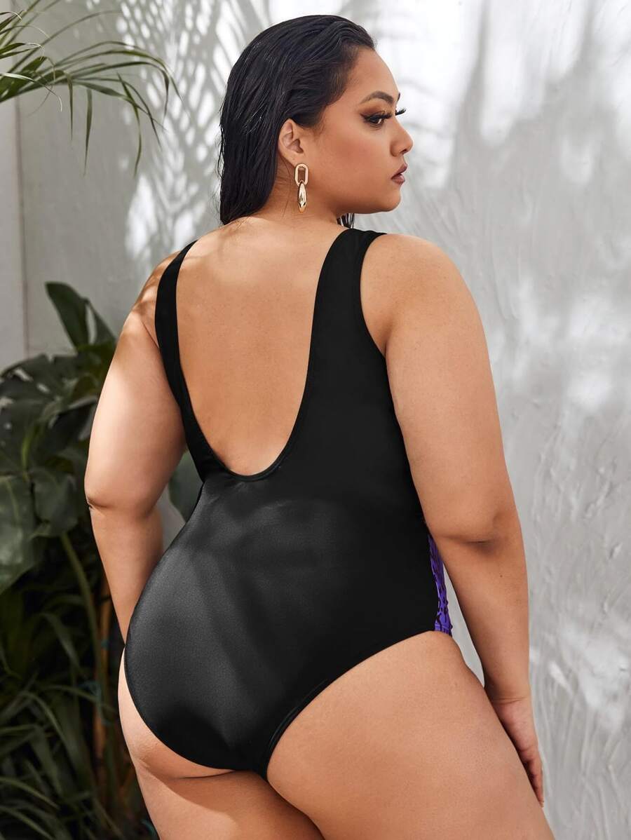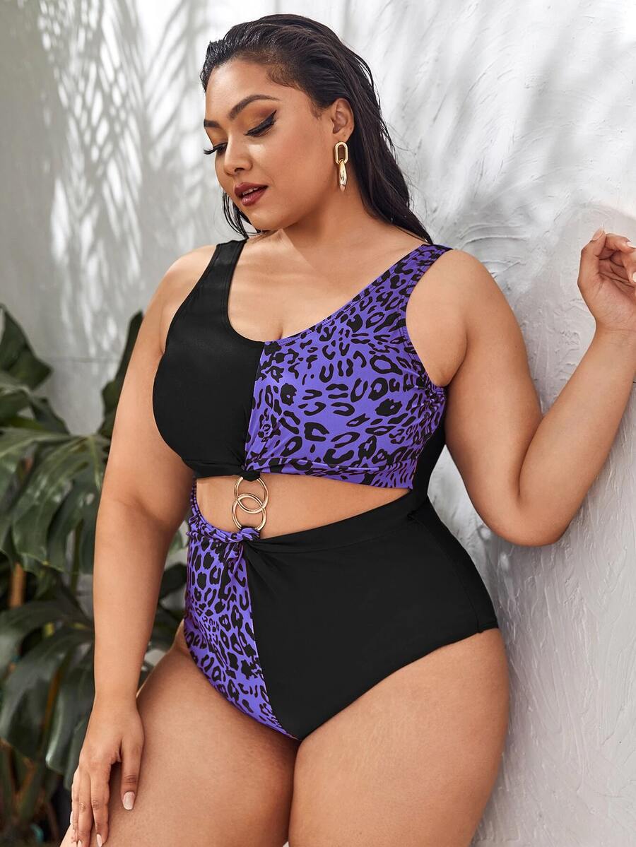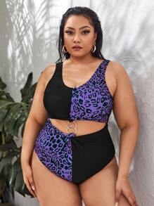 Plus Leopard Print Ring Linked One Piece Swimsuit