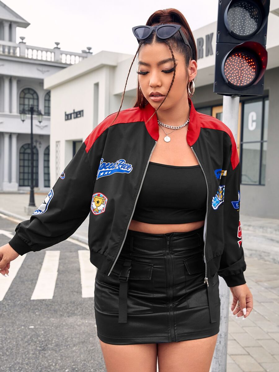 Plus Letter Graphic Colorblock Drop Shoulder Bomber Jacket