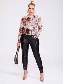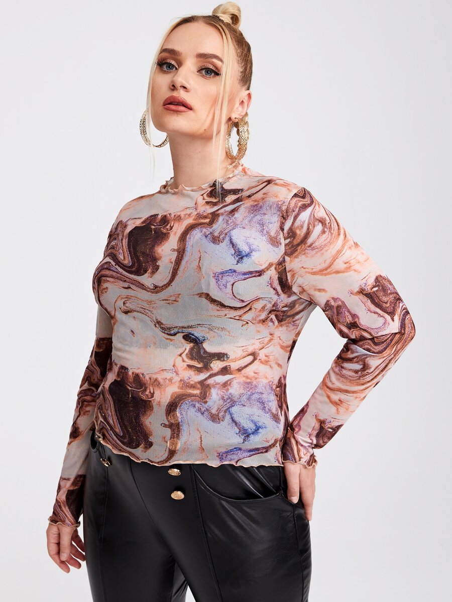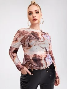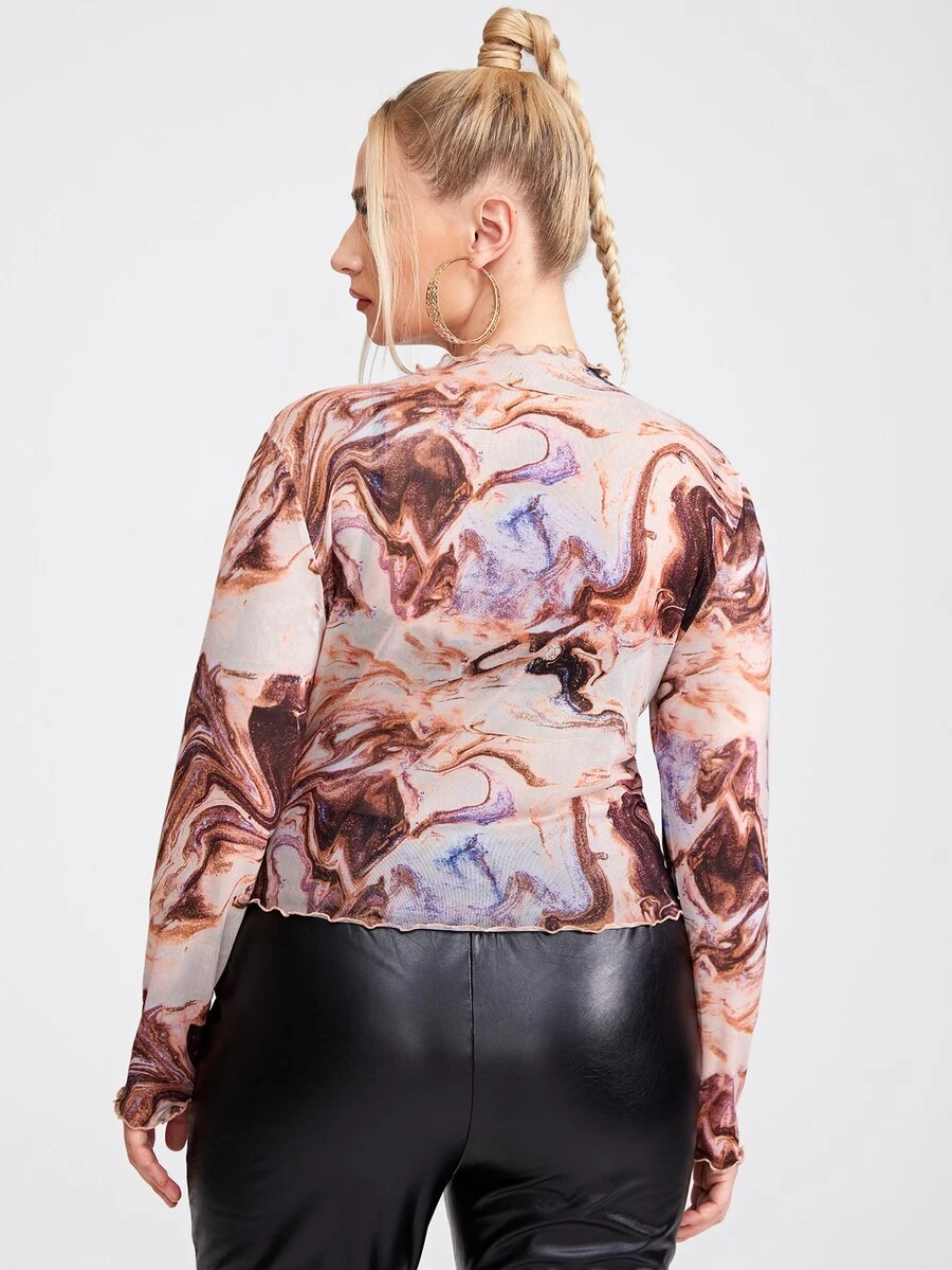 Plus Lettuce Trim Marble Print Mesh Top