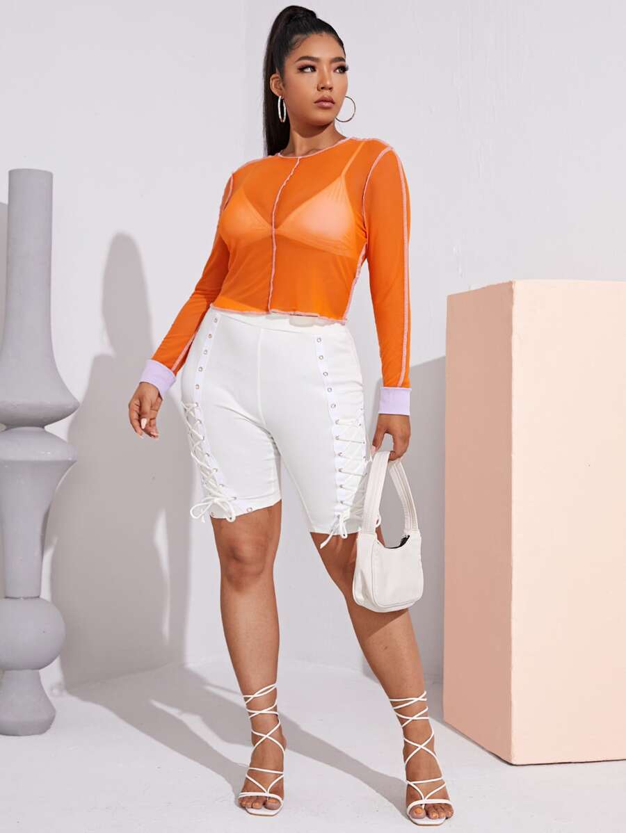 Plus Neon Orange Seam Front Mesh Top Without Bra