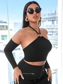 Plus O-ring Detail Backless Crop Halter Top With Elbow Sleeve