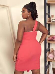 Plus One Shoulder Peekaboo Drawstring Contrast Topstitching Bodycon Dress