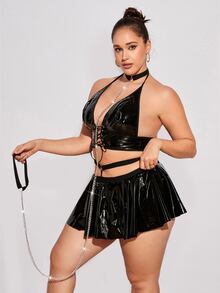 Plus PU Leather Lace Up Front Halter Lingerie Set