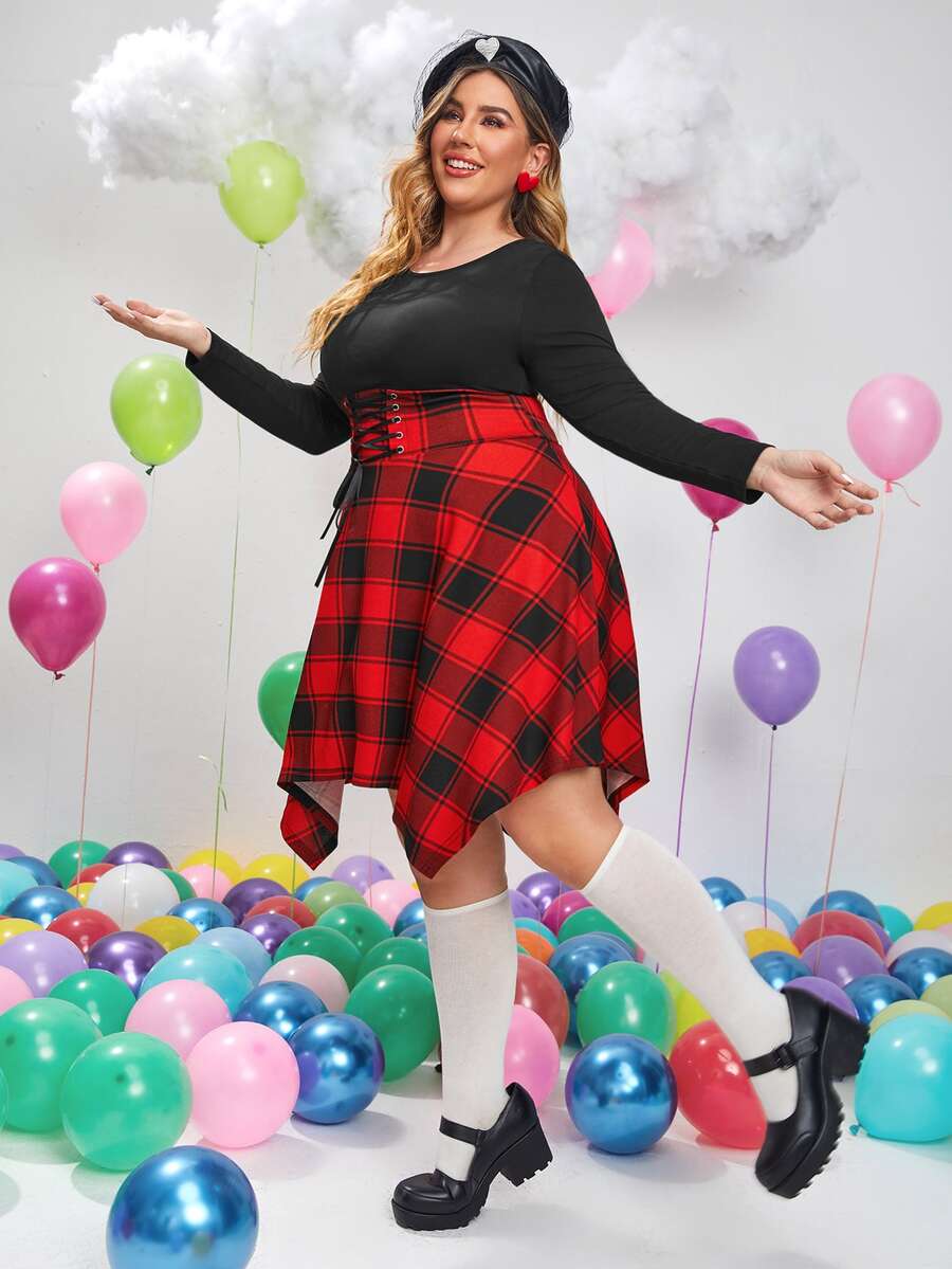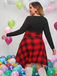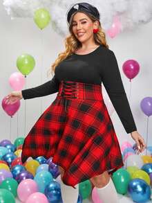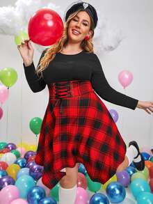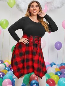 Plus Plaid Grommet Lace Up Asymmetrical Hem Dress